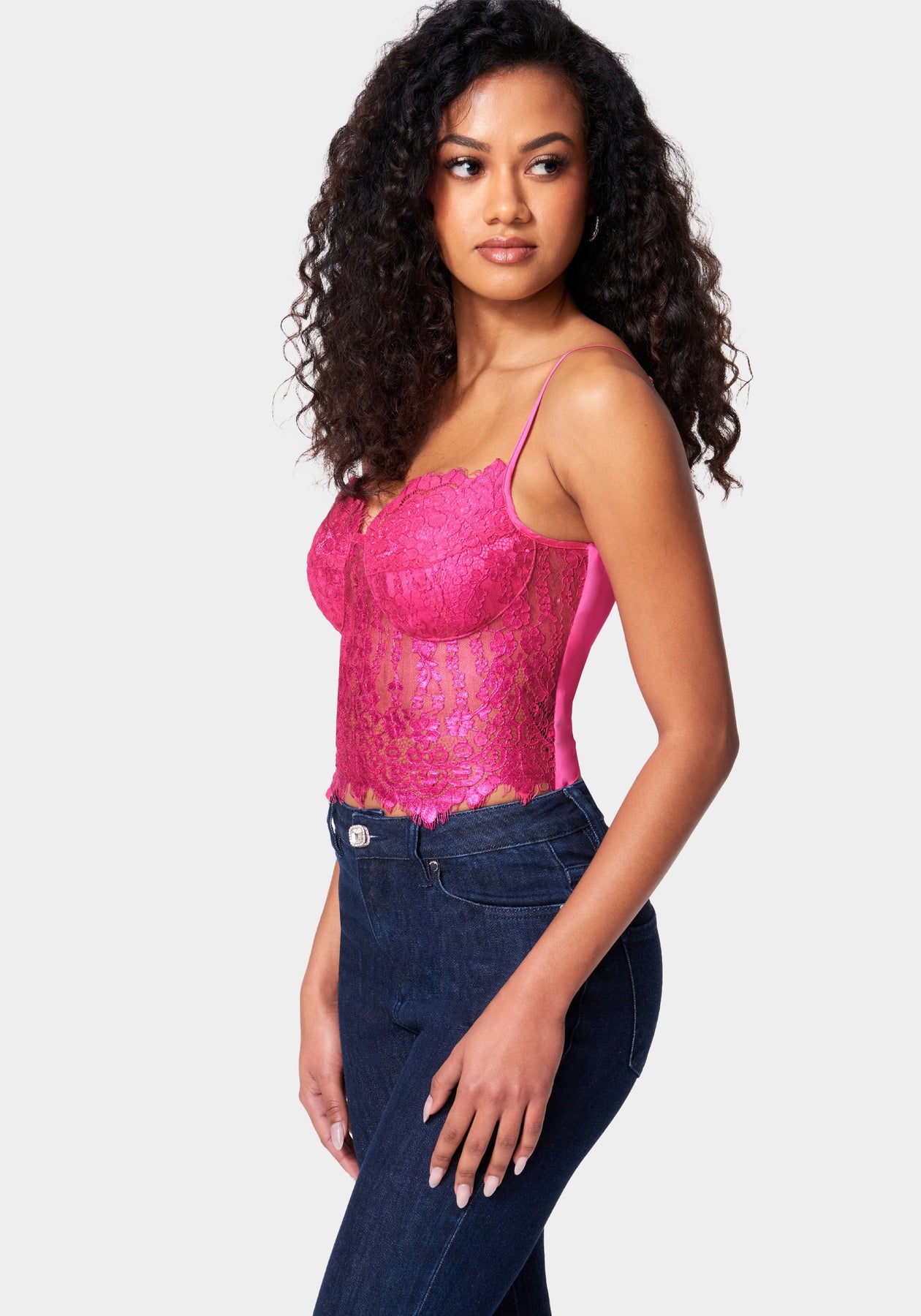 Simply stunning. This sheer lace and metallic foiled bustier top features delicate floral embroidery, a low-cut plunge neckline, structured cups, and a back zipper for easy styling.