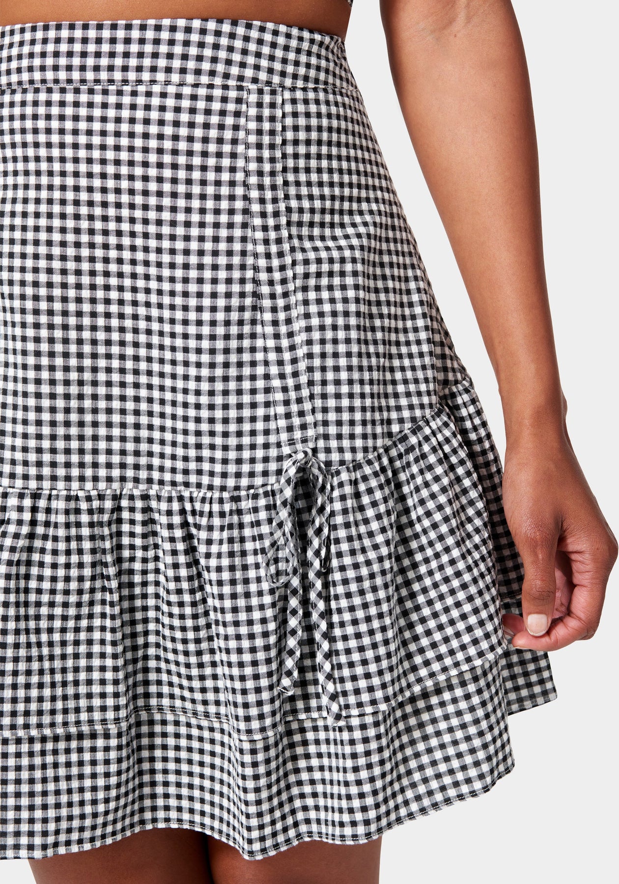 Life's a picnic. Made in gingham cotton, this knee-length flutter skirt features tiered front ruching and a back zipper closure for the perfect fit. Pairs with the Mini Gingham Ruched Front Cami for a romantic look.
