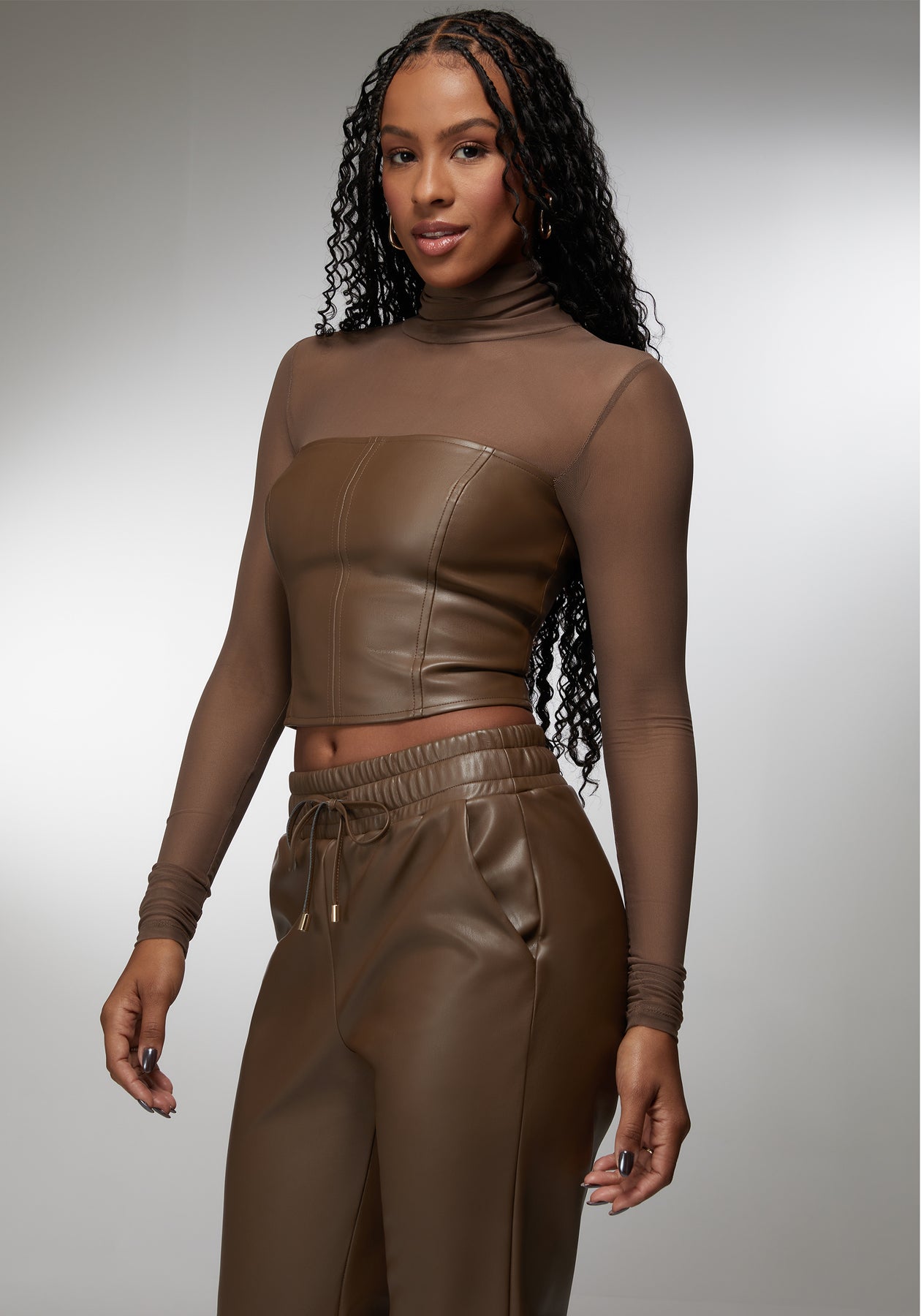 Embrace a new shade of bold with the bebe x Ciara mock neck top in chestnut. The rich vegan leather and provocative mesh detail serve up a look that's both sophisticated and daring. This piece isn't just a top — it's a power play.