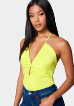 It's getting hot. This sultry halter top sports a flirty keyhole cutout design at the center front, self-tie back, and form-fitting silhouette for a style that slips into jeans or skirts effortlessly.