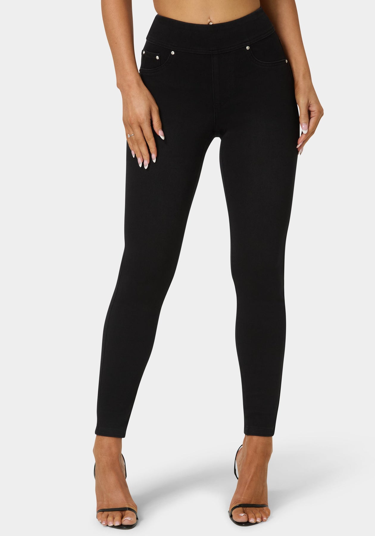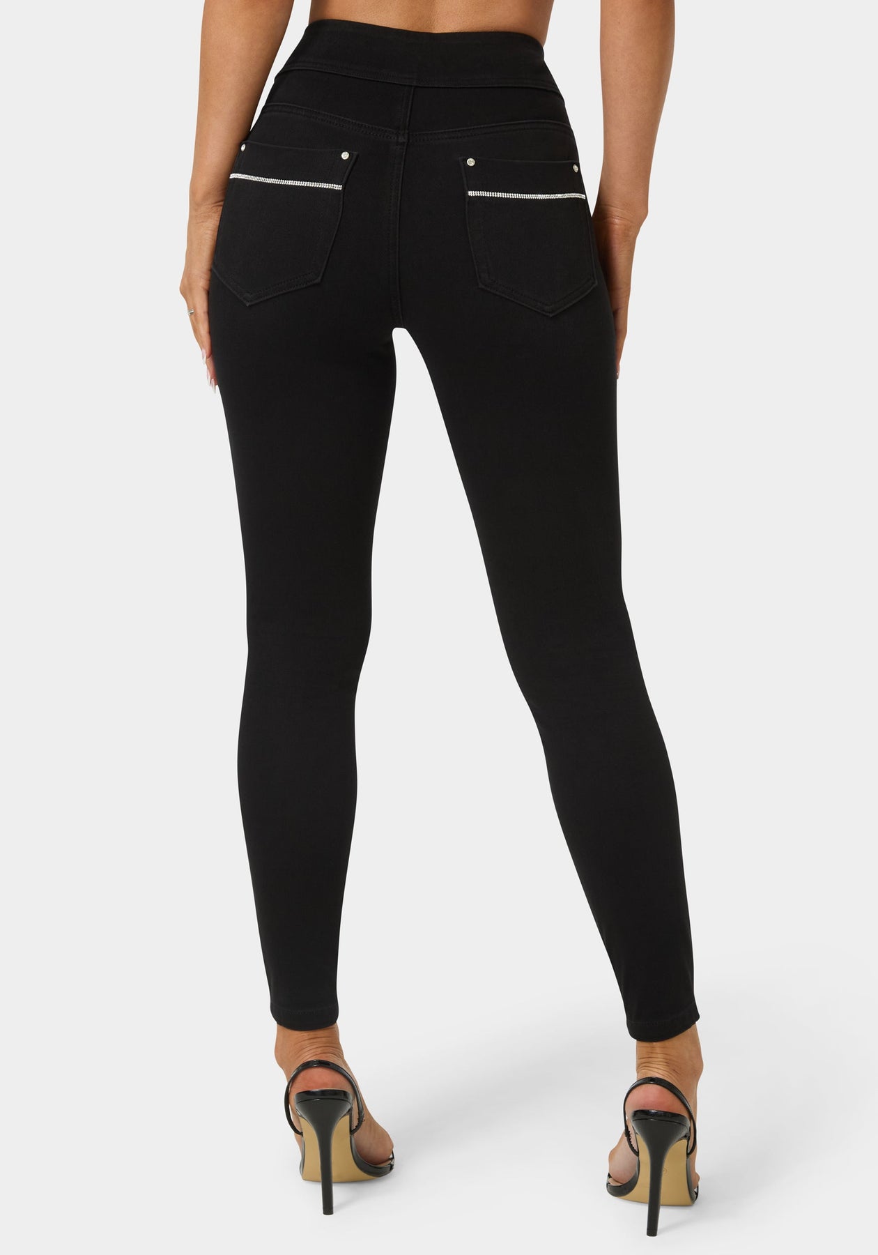 Stretch fabric with rhinestone rivets and elastic lining offers a casual yet opulent vibe for relaxed coffee runs or everyday adventures.