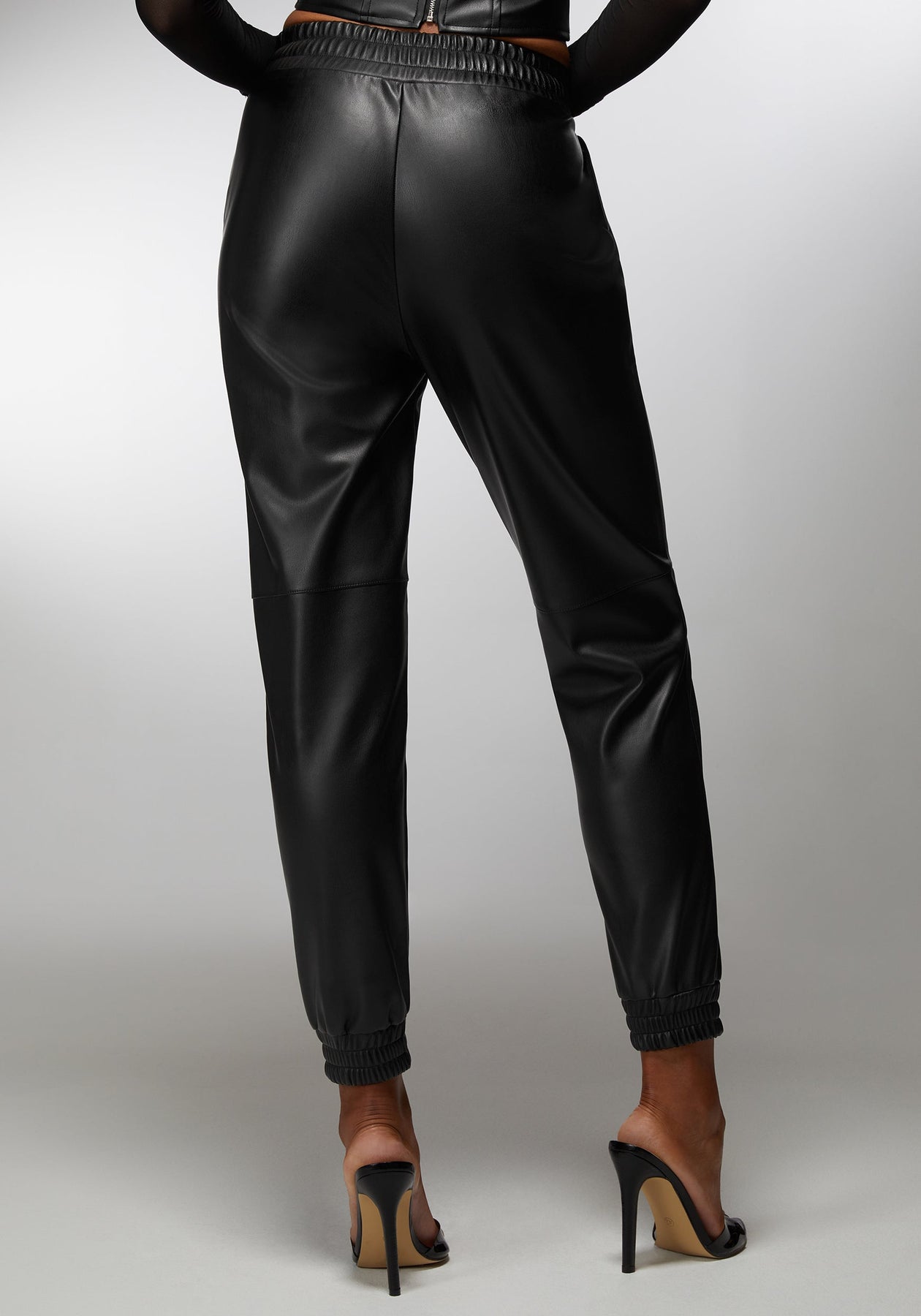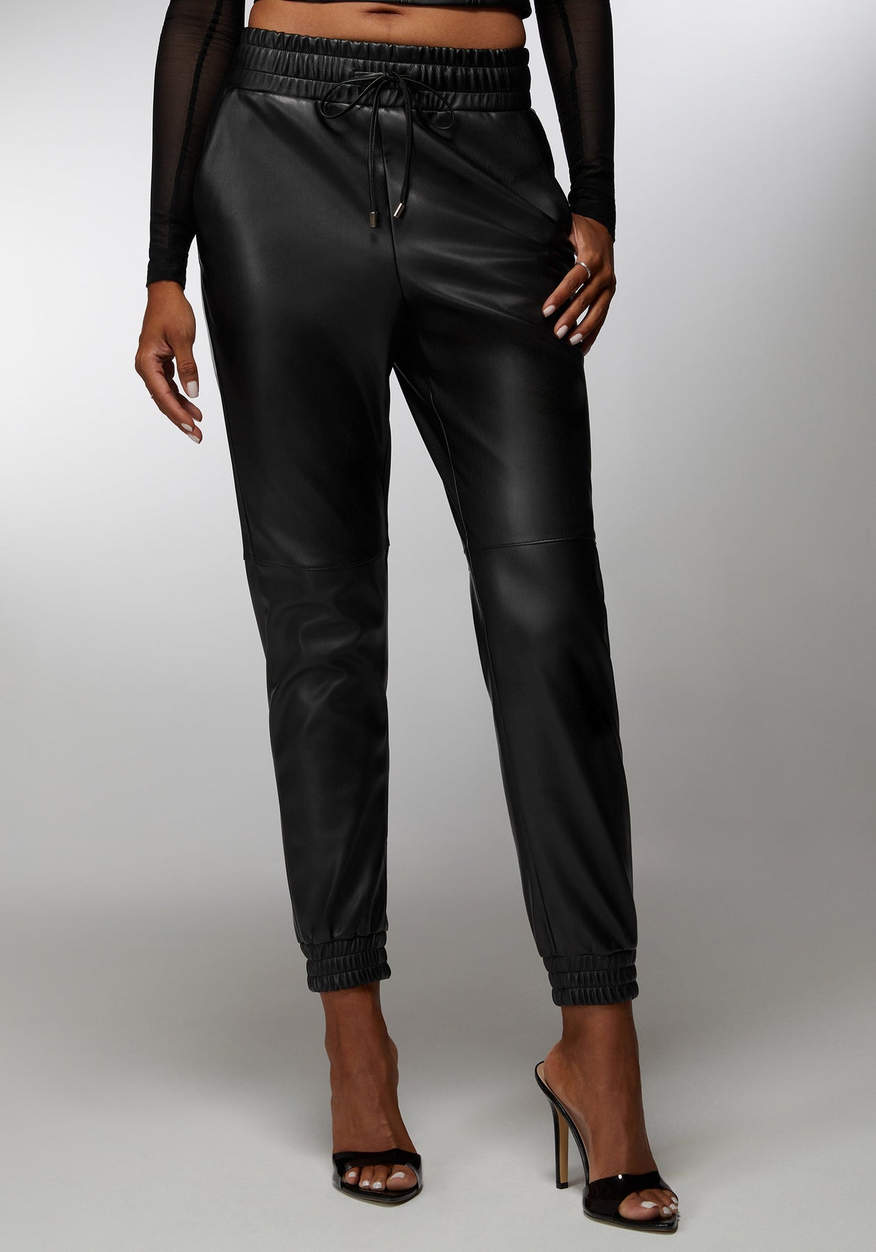 Elevate your jogger game with the bebe x Ciara natural waist vegan leather pair in black. These joggers are all about making a sleek statement without trying too hard. Ideal for versatile styling, they're the go-to for any scene, serving luxury with every step.