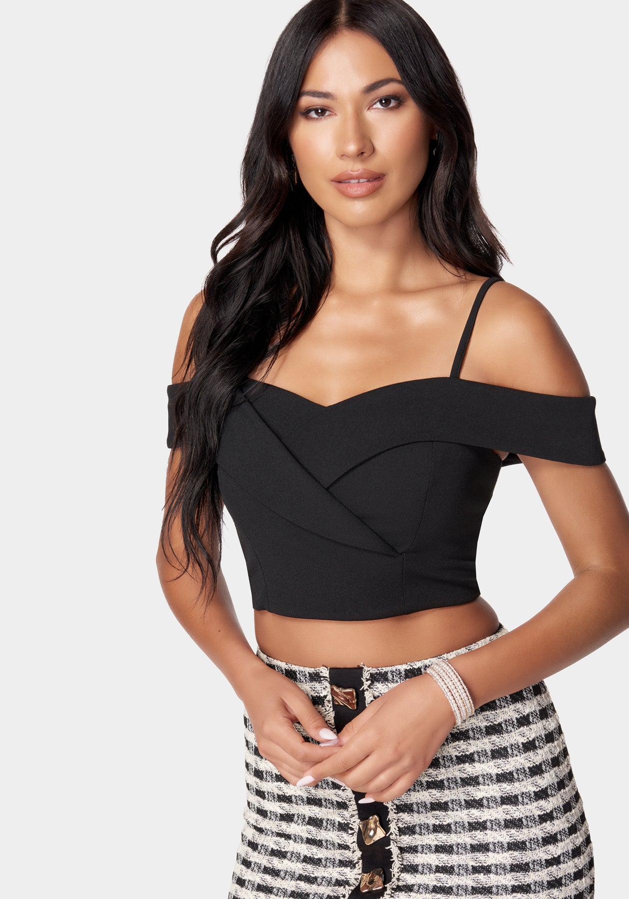 Rendered in sultry black, this unique off-shoulder knit top is a blend of style and subtlety. The closed mesh upper and lace-up closure add an edgy refinement, while the bebe logo detailing subtly boasts of your superior taste in fashion. It's figure-hugging fit and flattering off-shoulder neckline make it your go-to piece for your next stylish rendezvous!