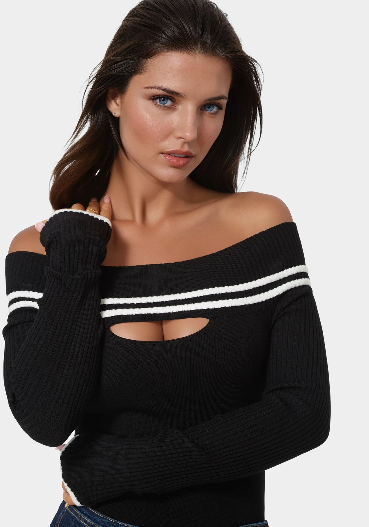 Stretch fabric with a peek-a-boo neckline and long sleeves creates a sultry off-shoulder look, ideal for fireside hangouts or cozy brunches.
