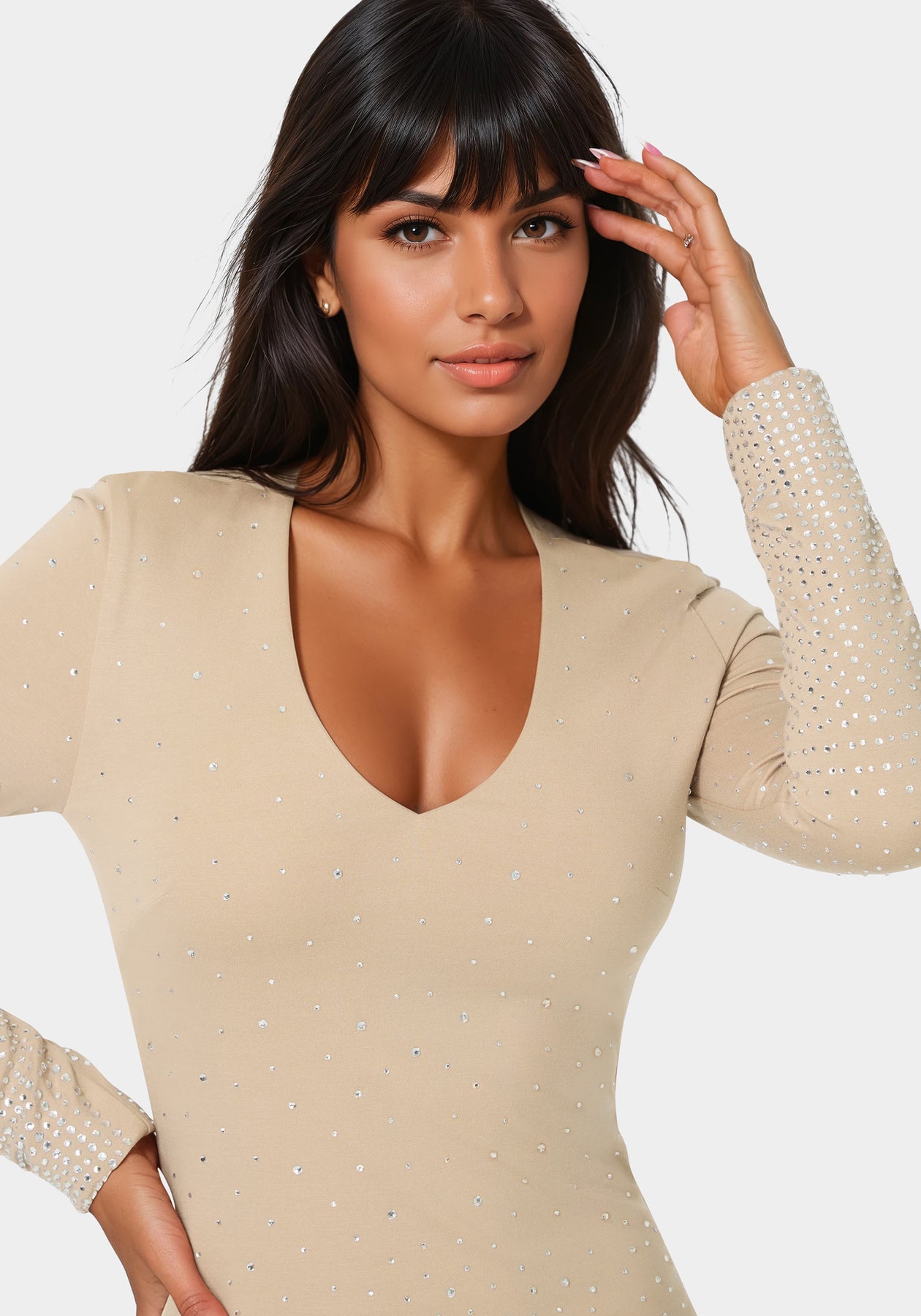Long-sleeve bodycon mini with striking ombre crystal details; a bold choice for vibrant nights or festive celebrations.