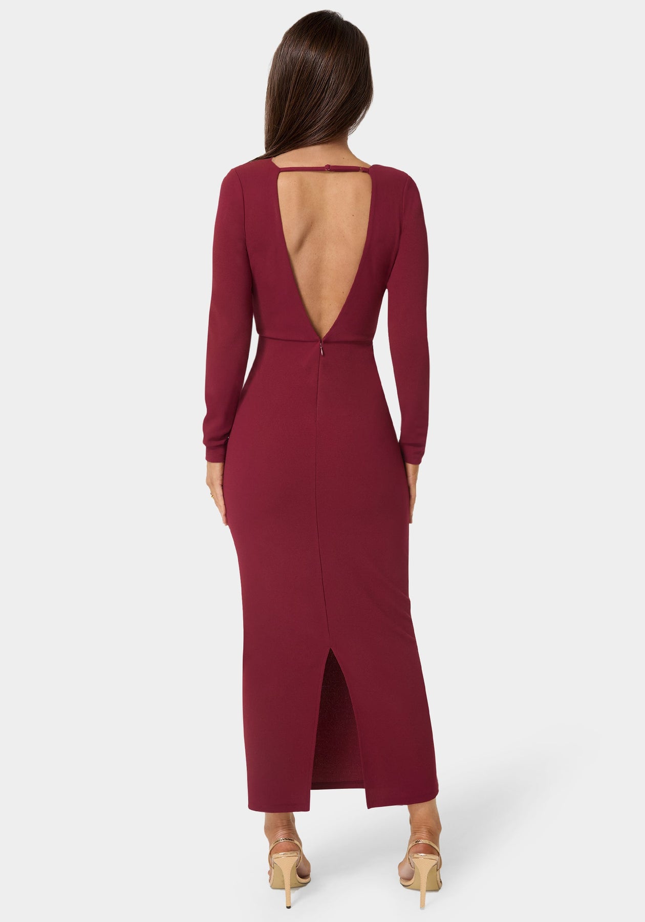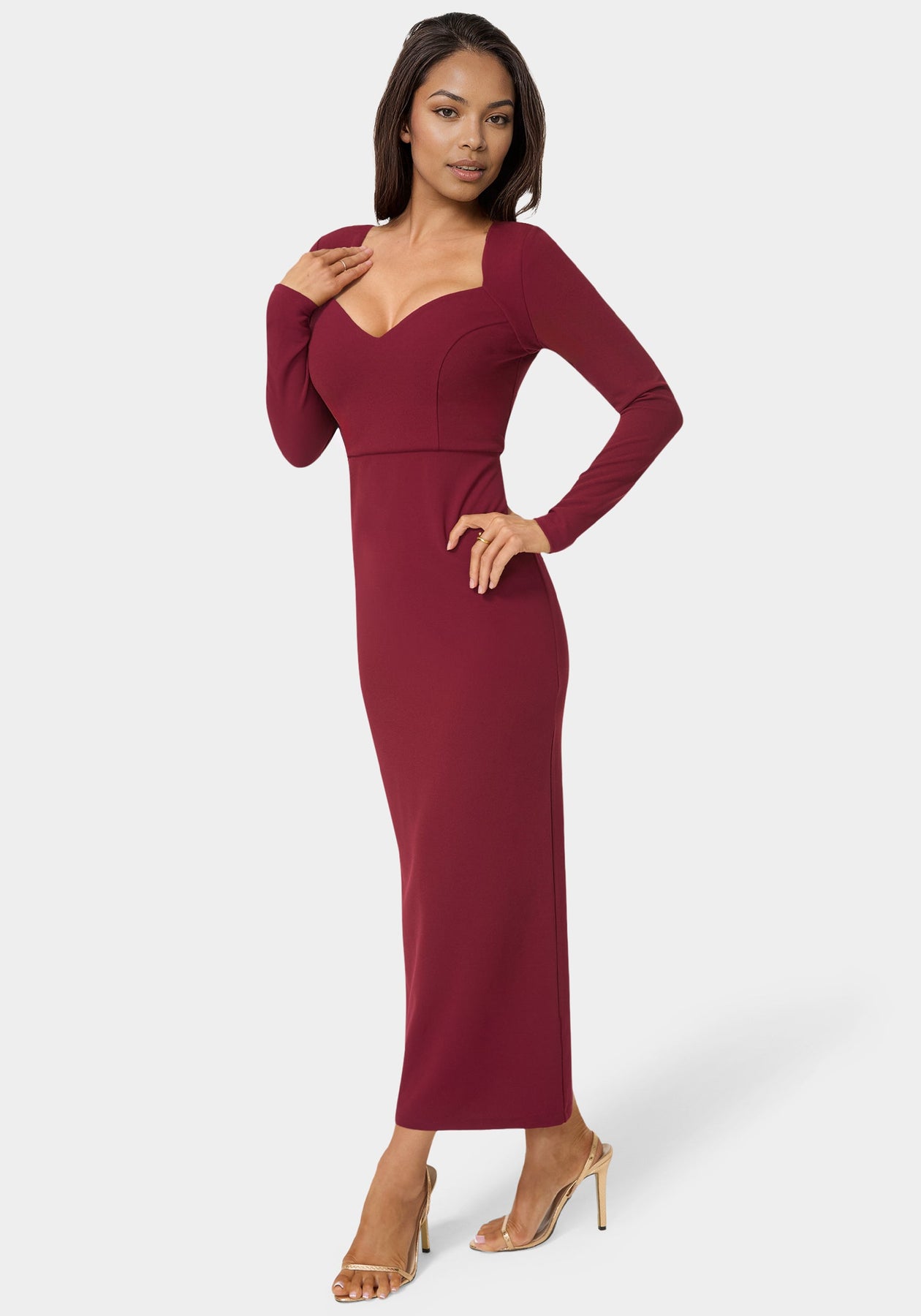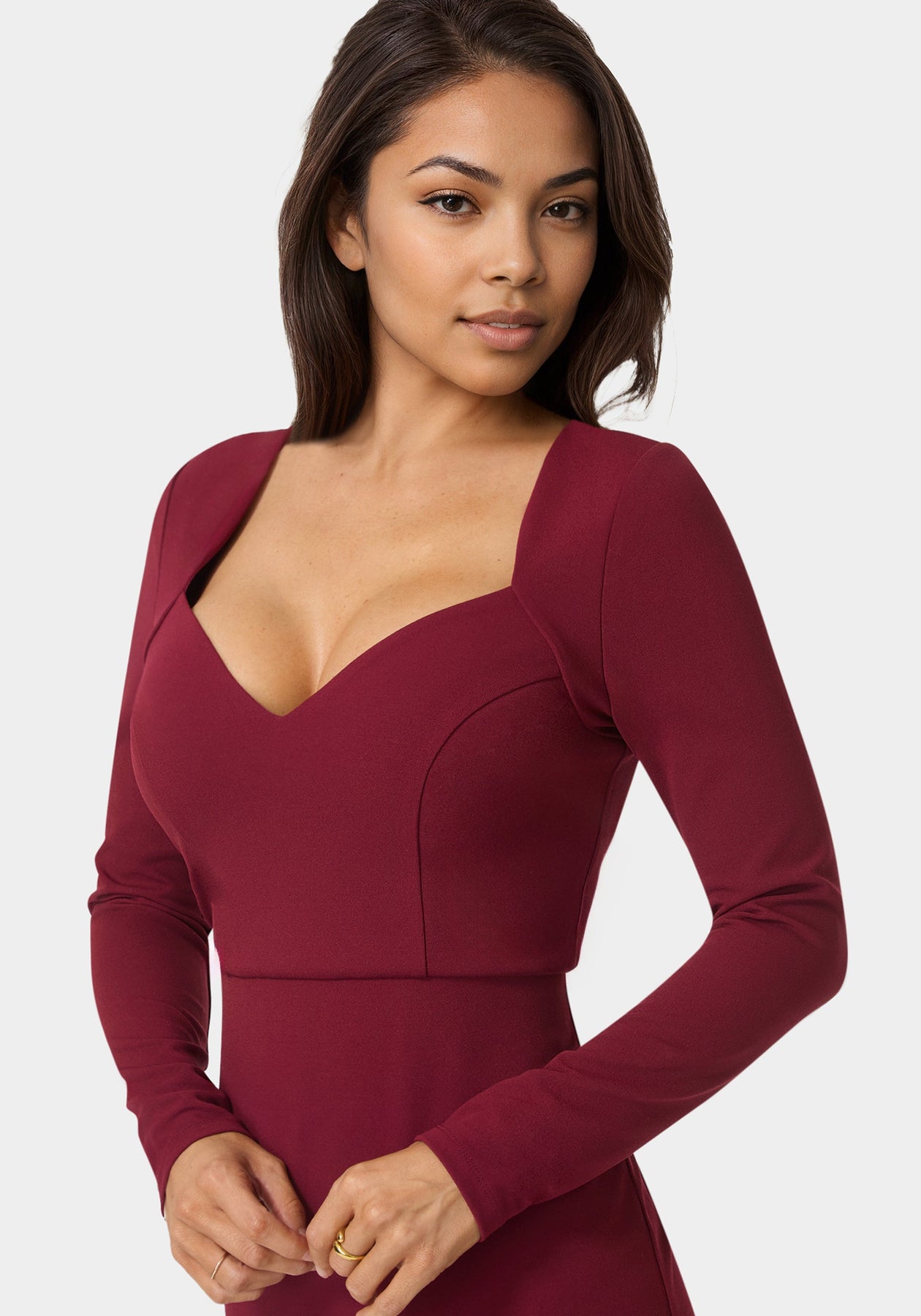 This long sleeve maxi dress features a sweetheart neckline and open-back detail. Its flowy silhouette is ideal for weddings, gala dinners, or any event where drama meets simplicity.
