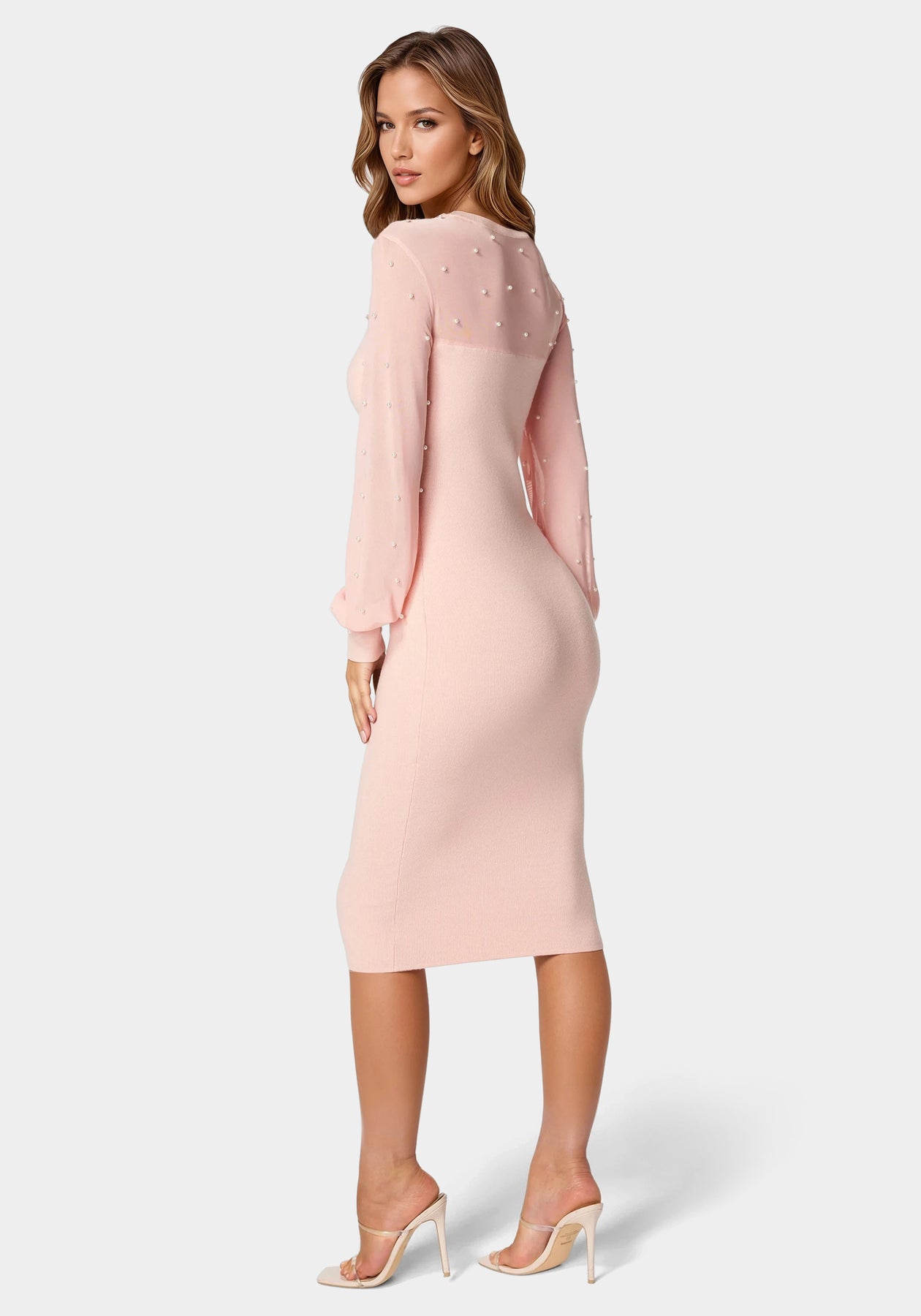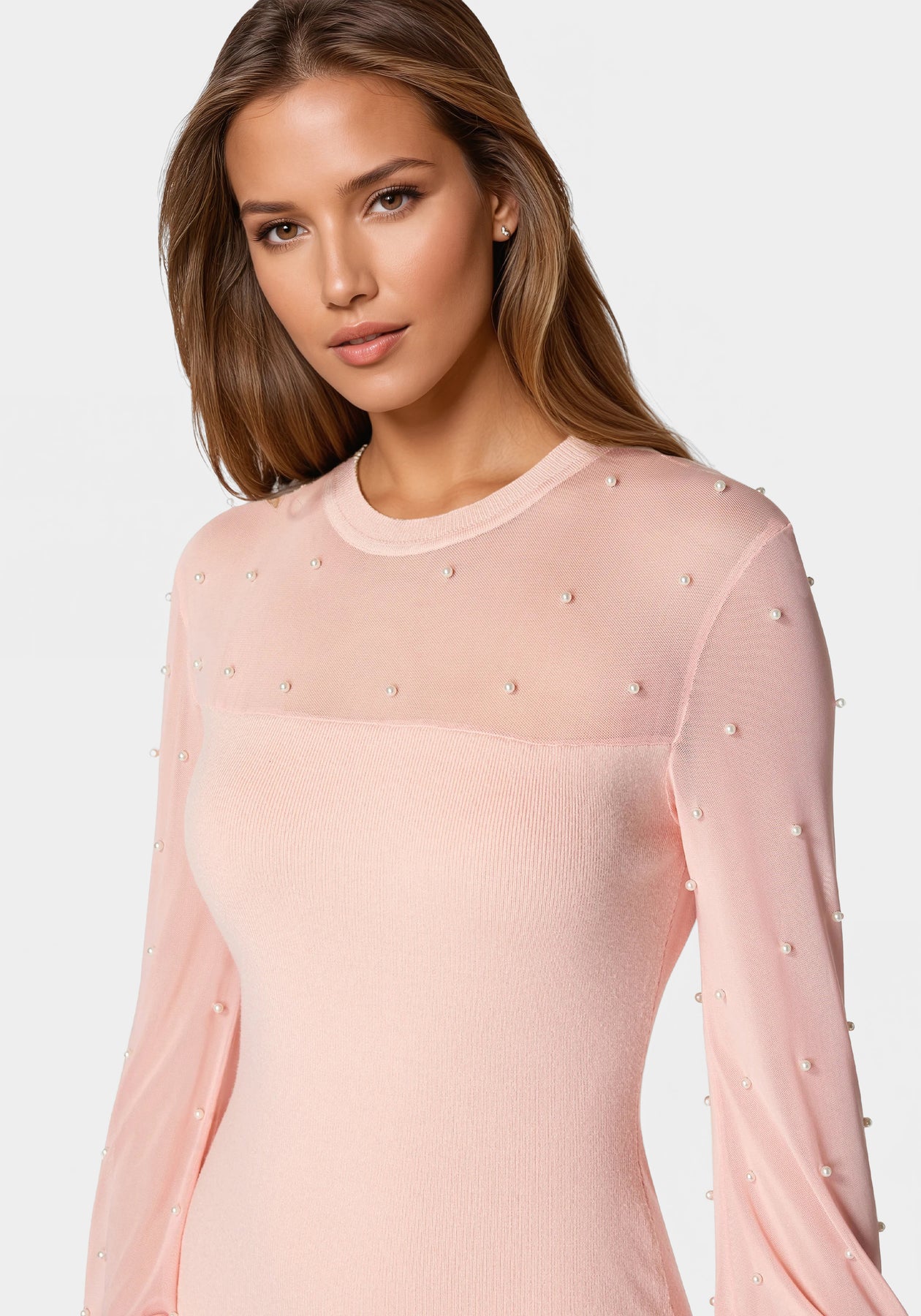 Step into the holiday season with elegance in our seductive LBD, designed with a mesh neckline and sleeves adorned with delicate pearl detailing. This bodycon dress hugs your curves beautifully, exuding a sultry yet sophisticated vibe. Complete your ensemble with your favorite heels and a chic bag, perfect for any festive event. Make a stunning impression on every occasion with this glamorous outfit.