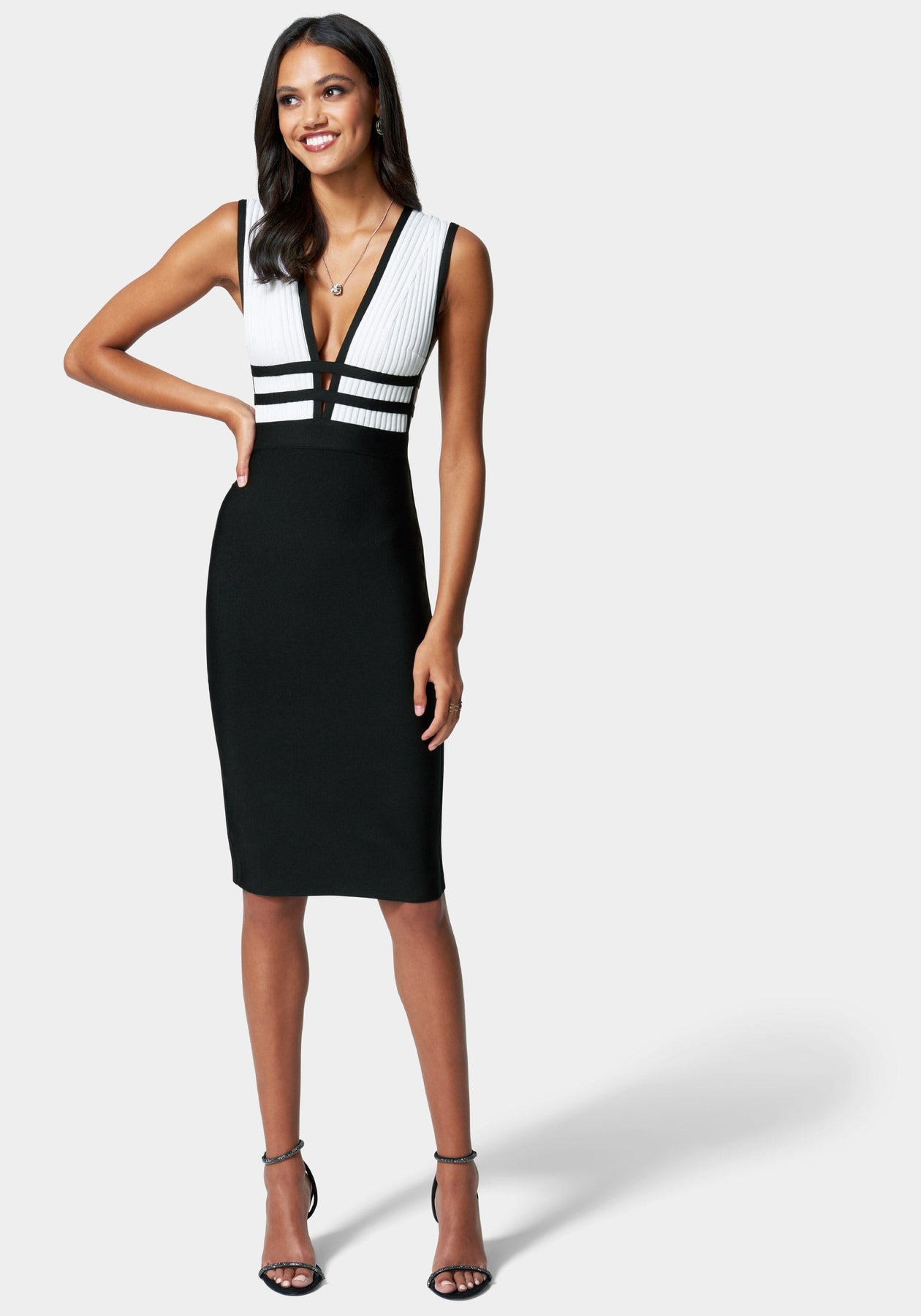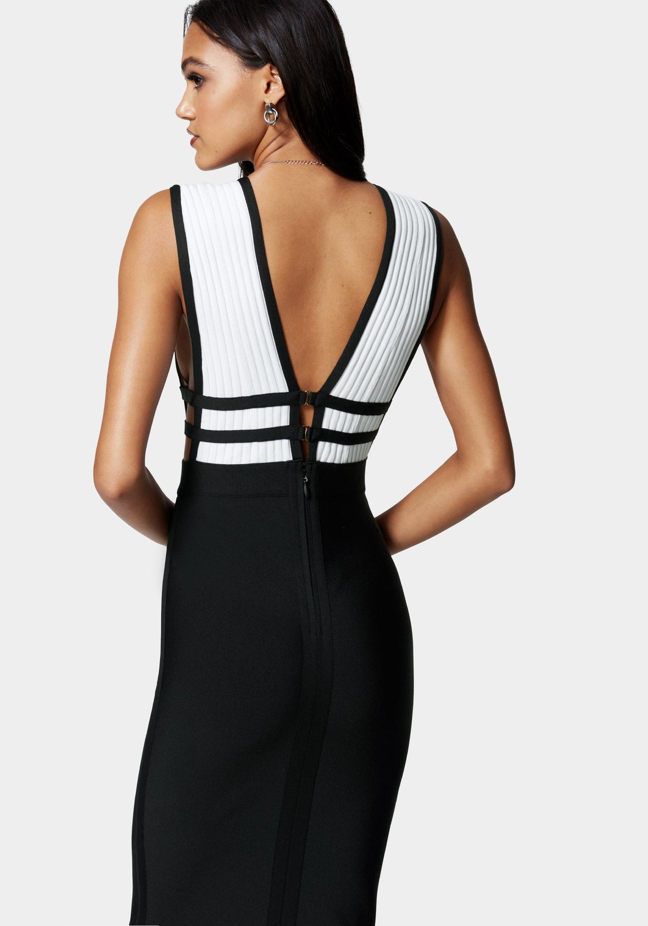 Top to bottom sexy. This sleek midi dress comes in a stretchy bandage design that makes every curve look perfect. Has deep front and back V-necks.