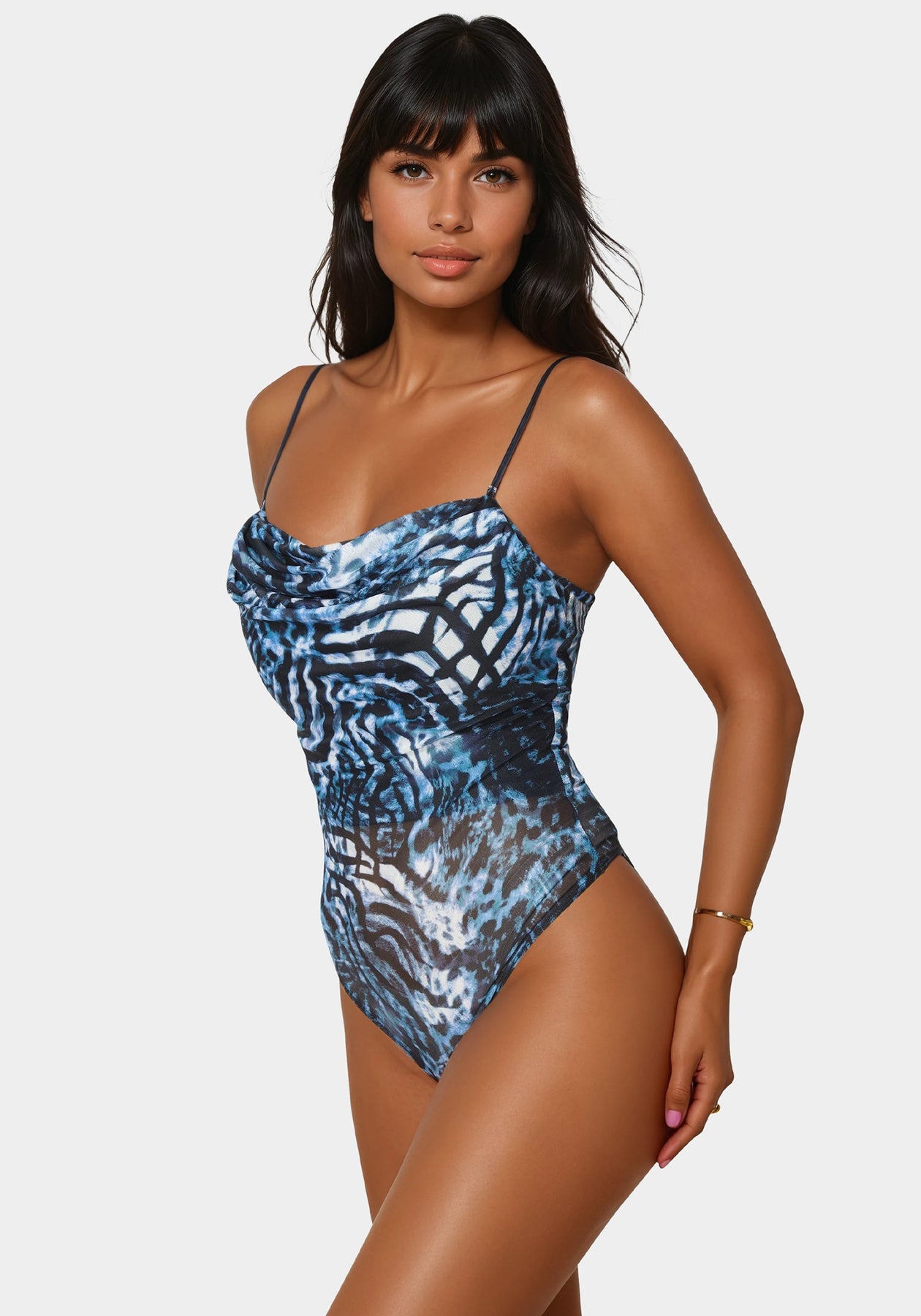 Bold and romantic, this plunging mesh bodysuit boasts adjustable straps and a body-hugging fit for night-outs. Layer with tailored pieces for an edgy, flawless look.