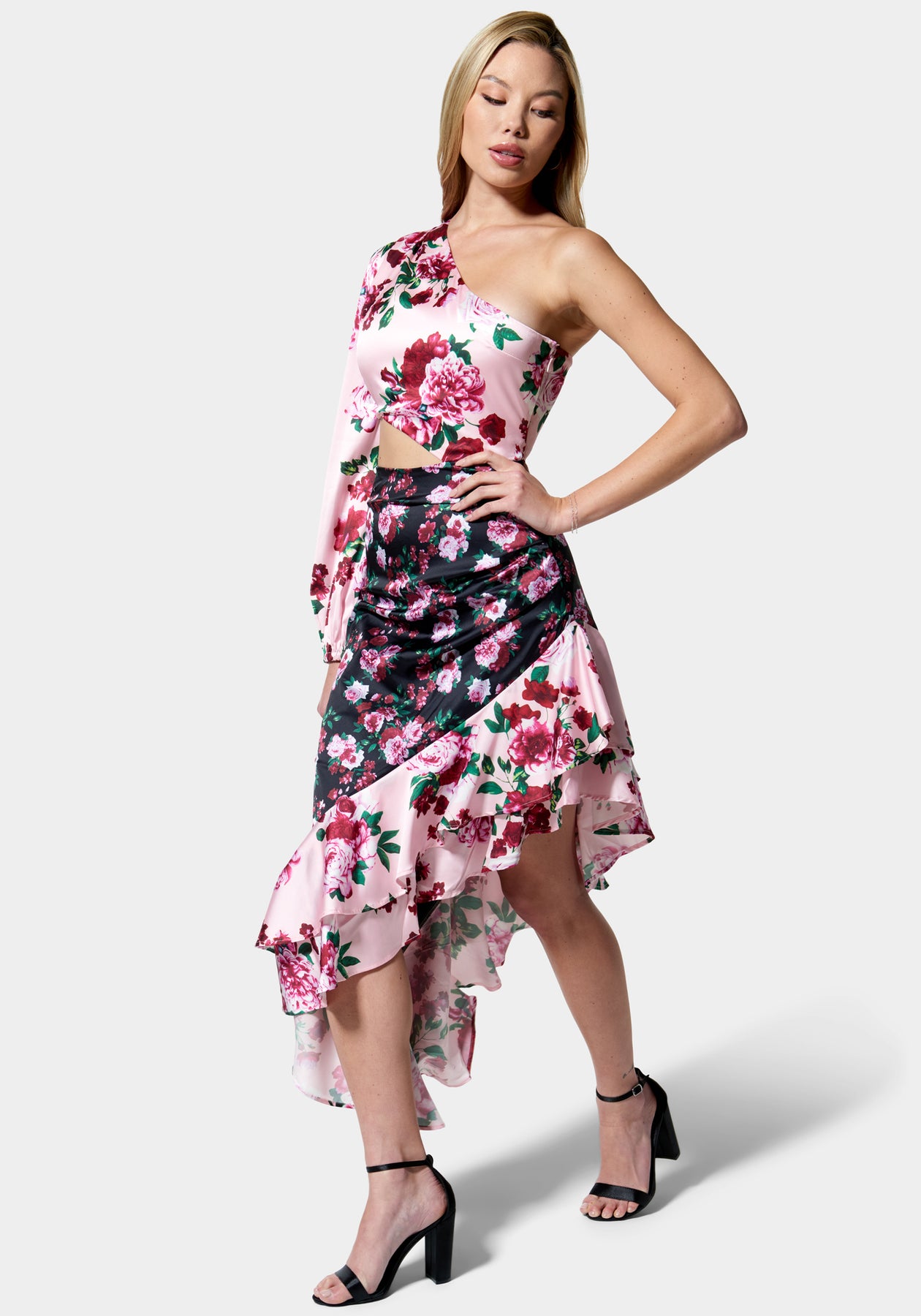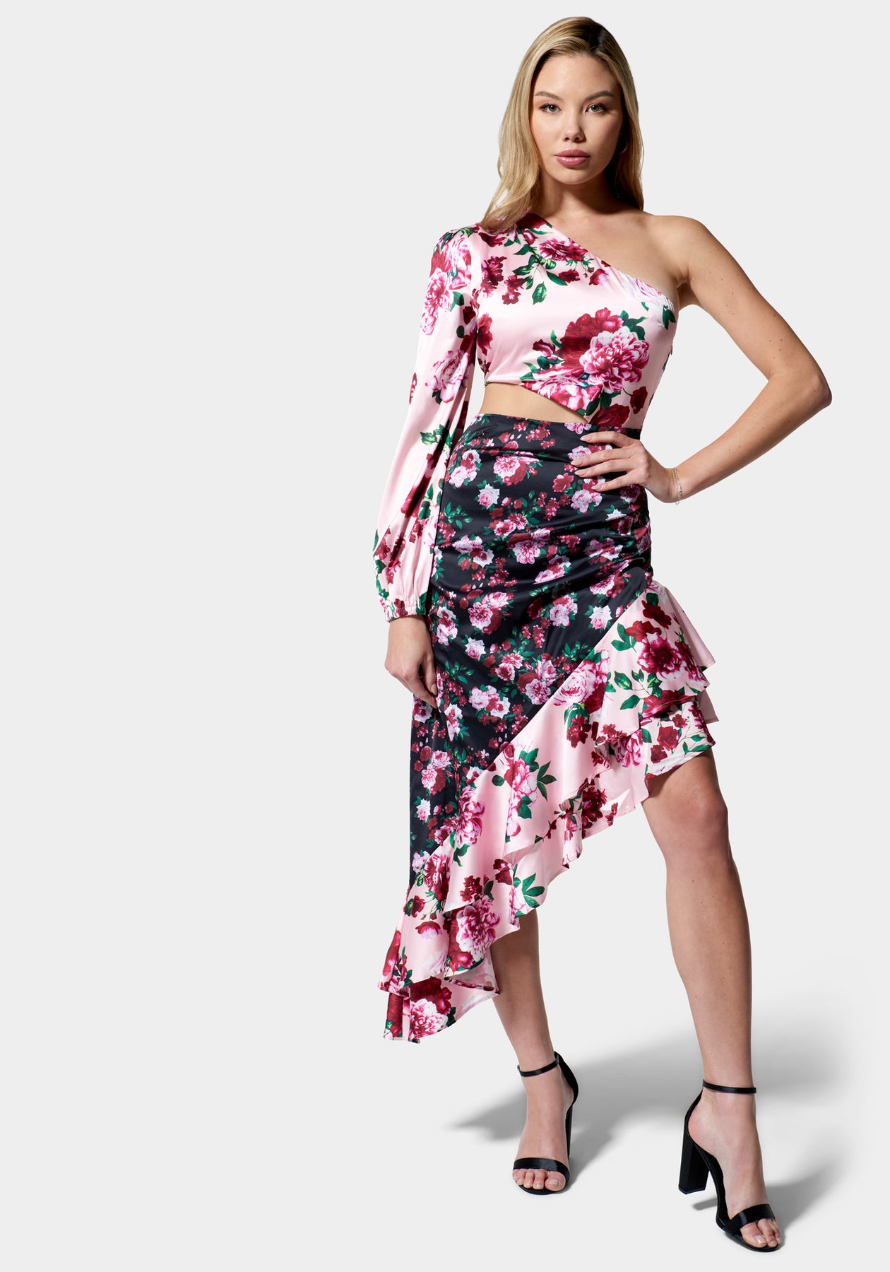 Bright and bold, this asymmetrical midi dress features an allover mixed floral print, a ruched skirt with ruffled trim, a single long sleeve, and a subtle waist cutout. Wear with heels to your next girls' night out or wherever there's a dance floor.