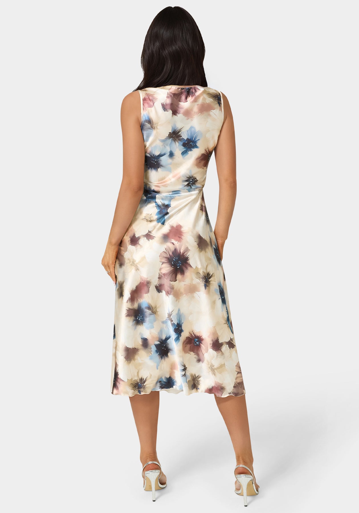 Satin elegance with a cowl neck, midi length, and sleeveless design; ideal for romantic dinners or city gatherings.