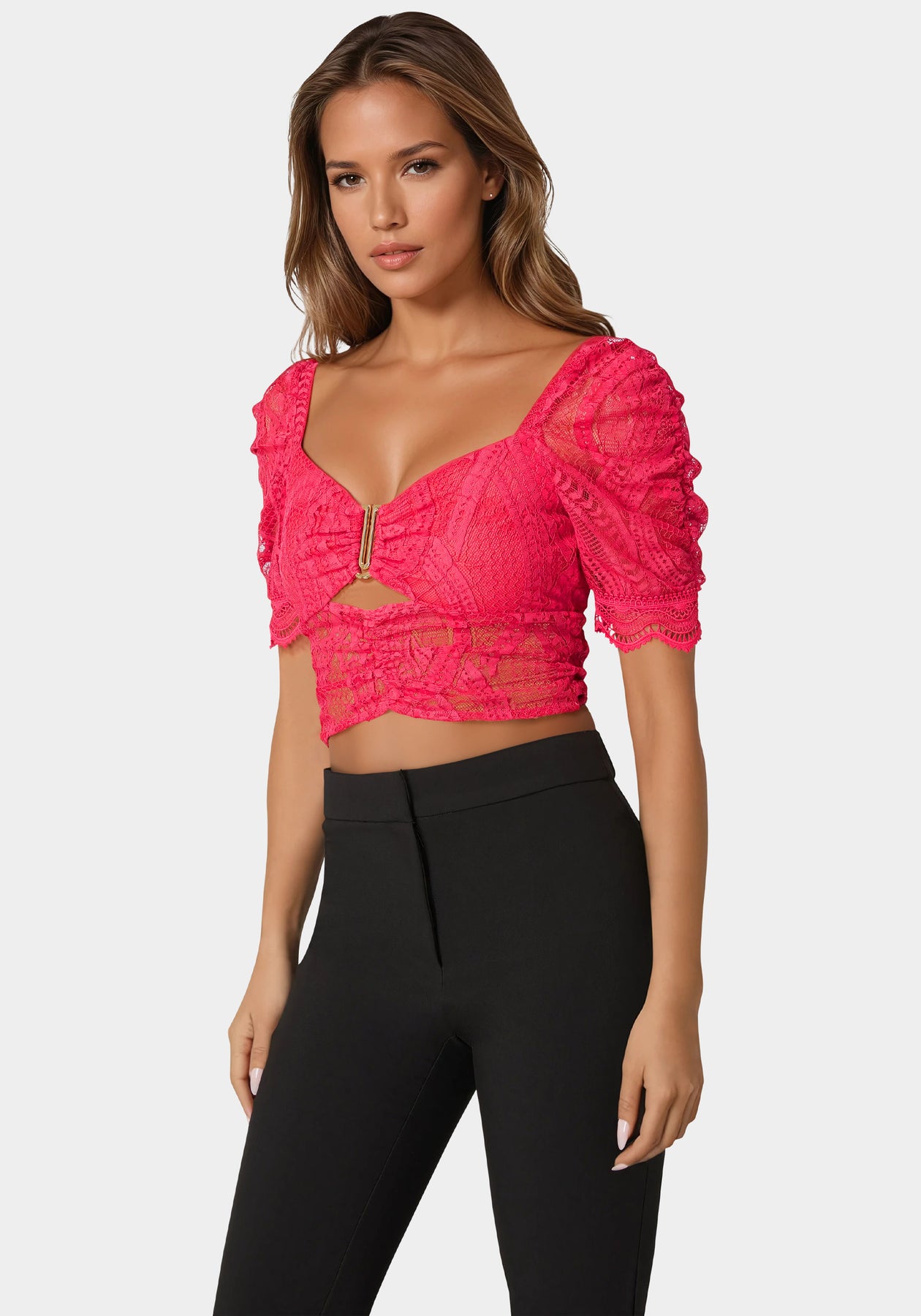 Embrace a romantic vibe with this trendy, cropped lace top. Billowy puff sleeves add a touch of feminine flair.