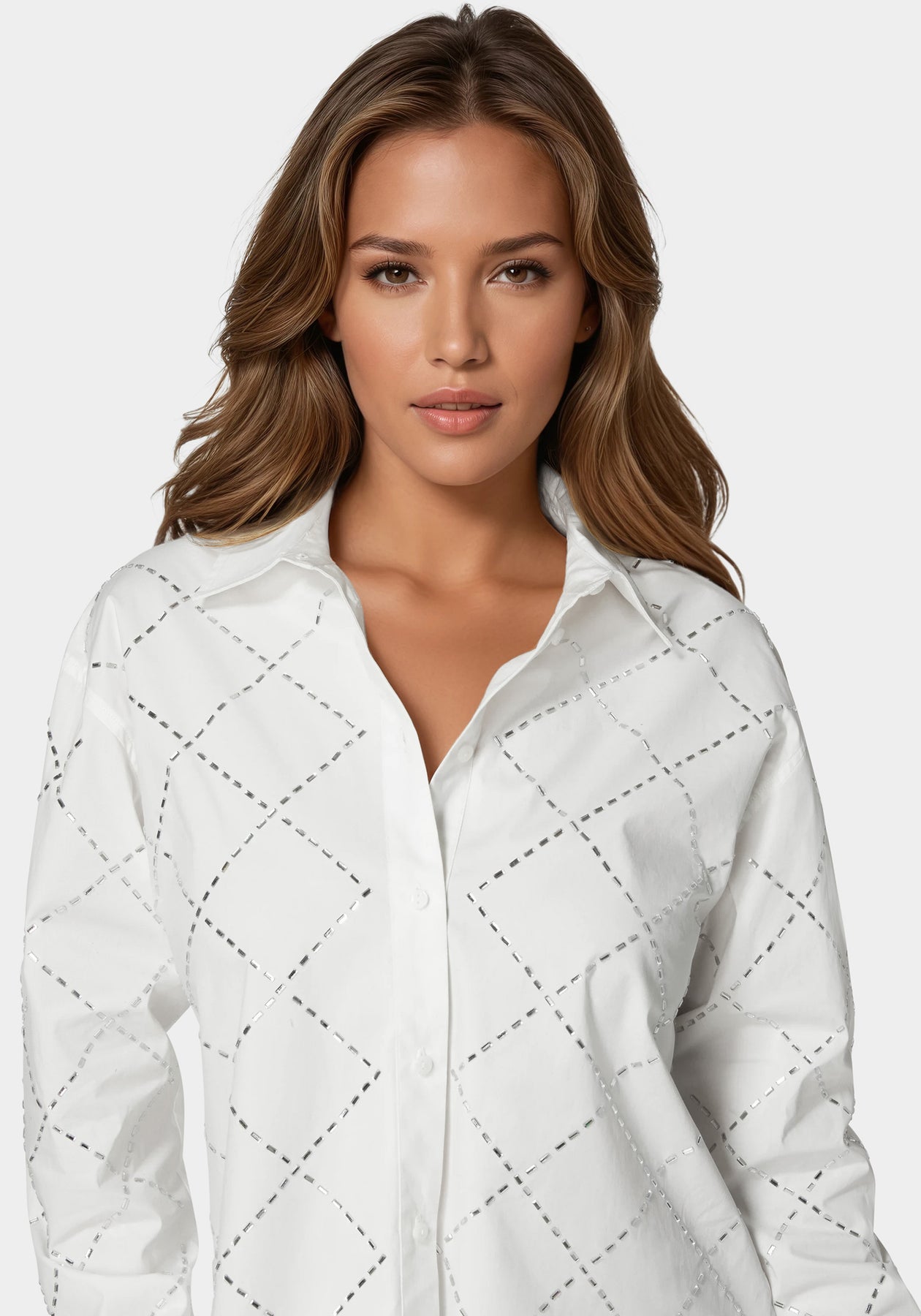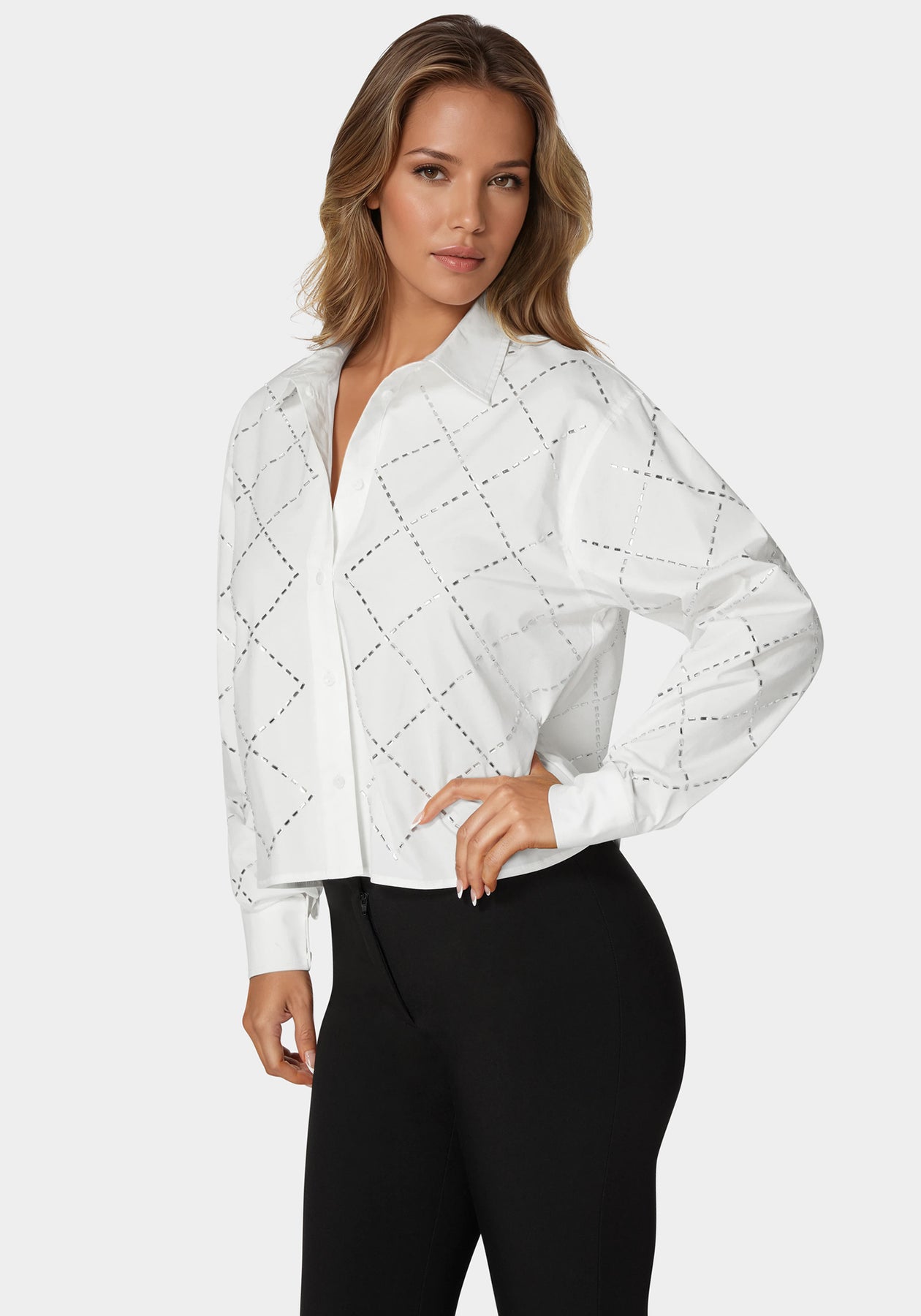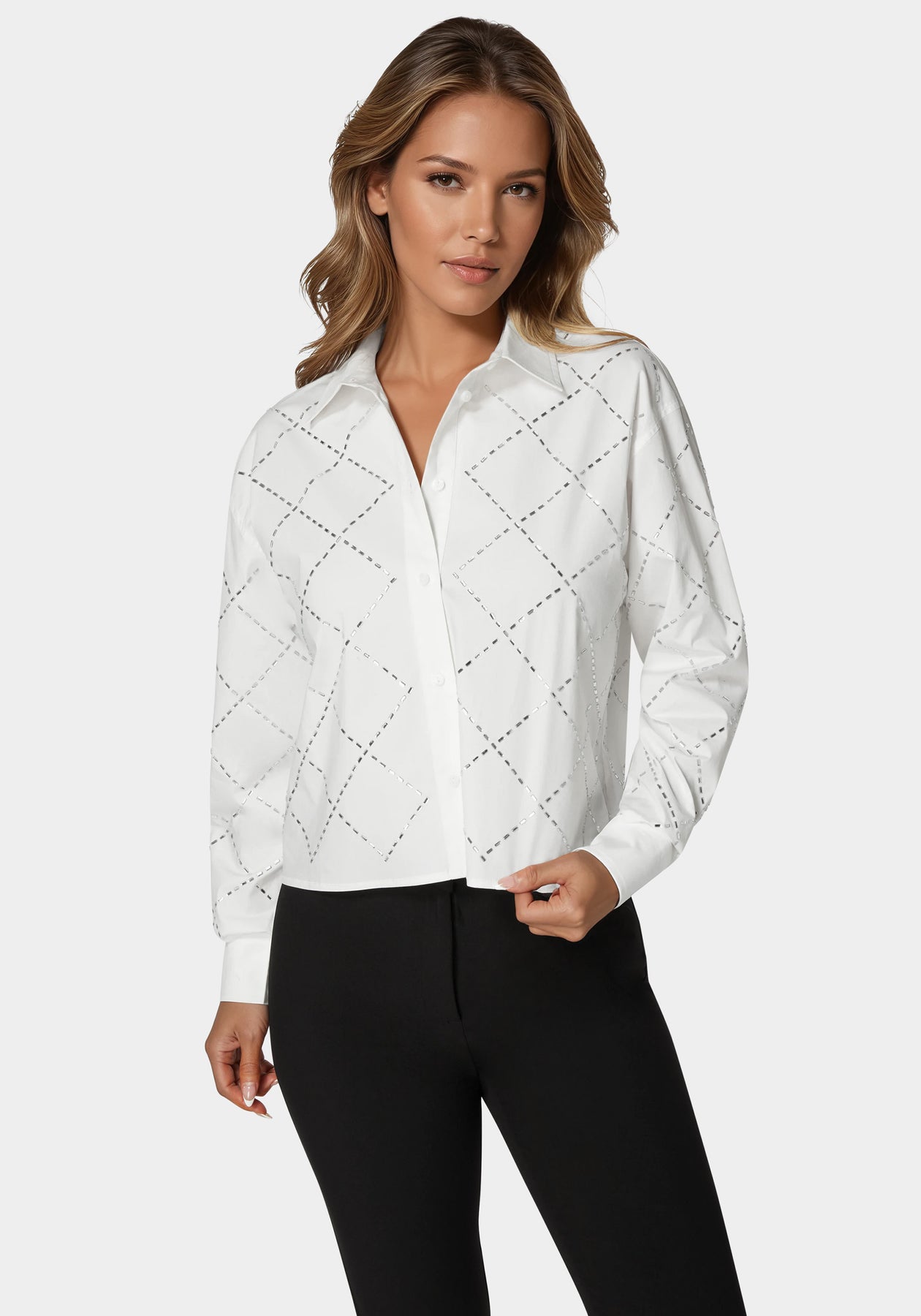 Elevate your look with a long sleeve blouse adorned with sparkling rhinestones. This top adds a touch of glamour to any outfit.