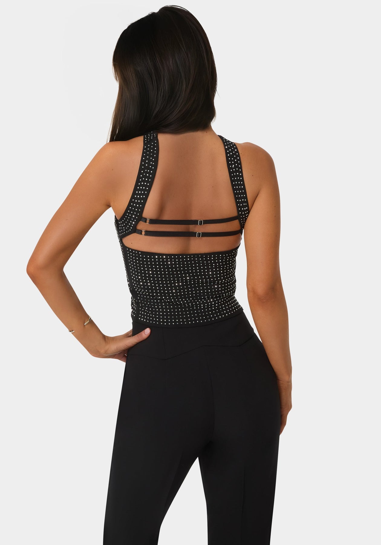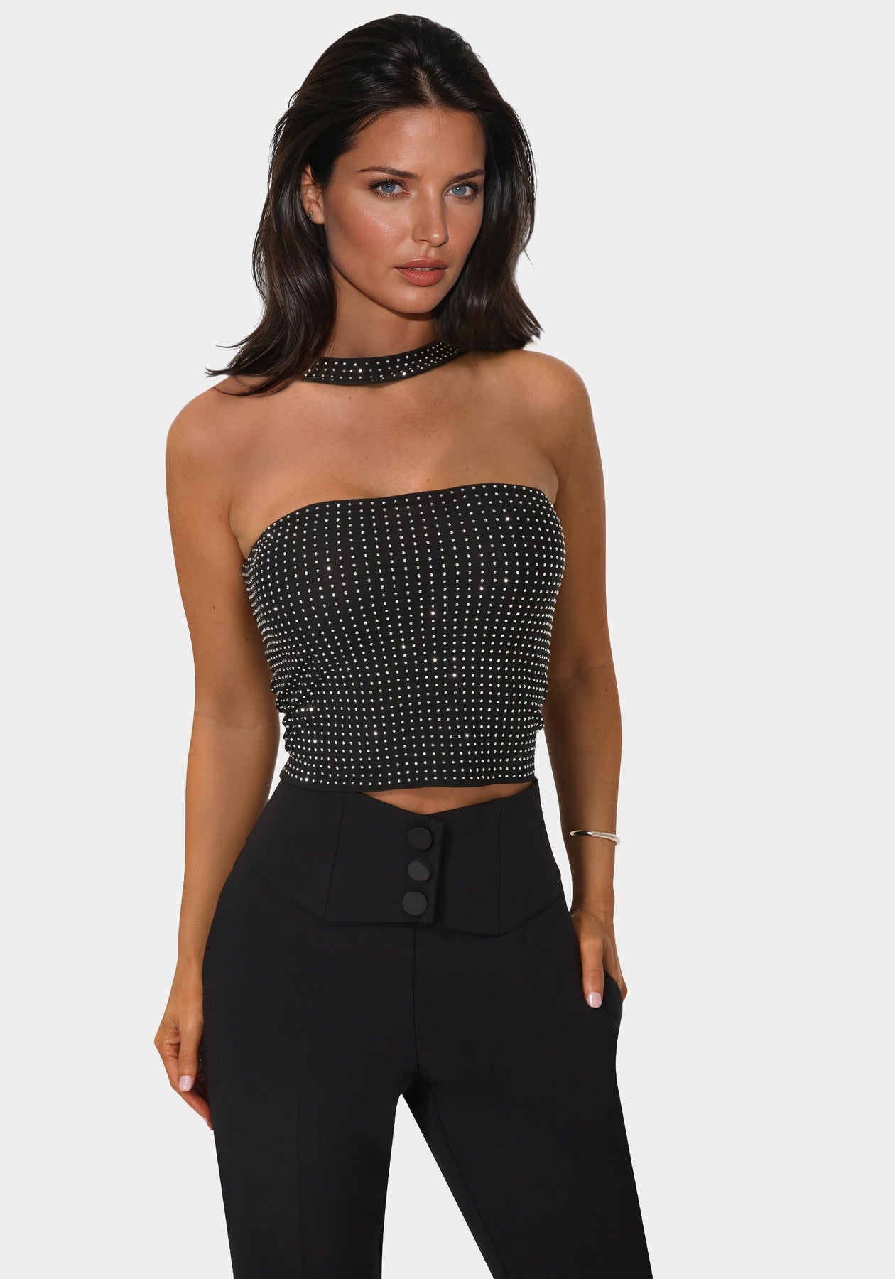 Get ready to amplify the night with this rhinestone mesh halter top. Dazzling and vibrant, it was made for the dance floor or spotlight moments with friends.