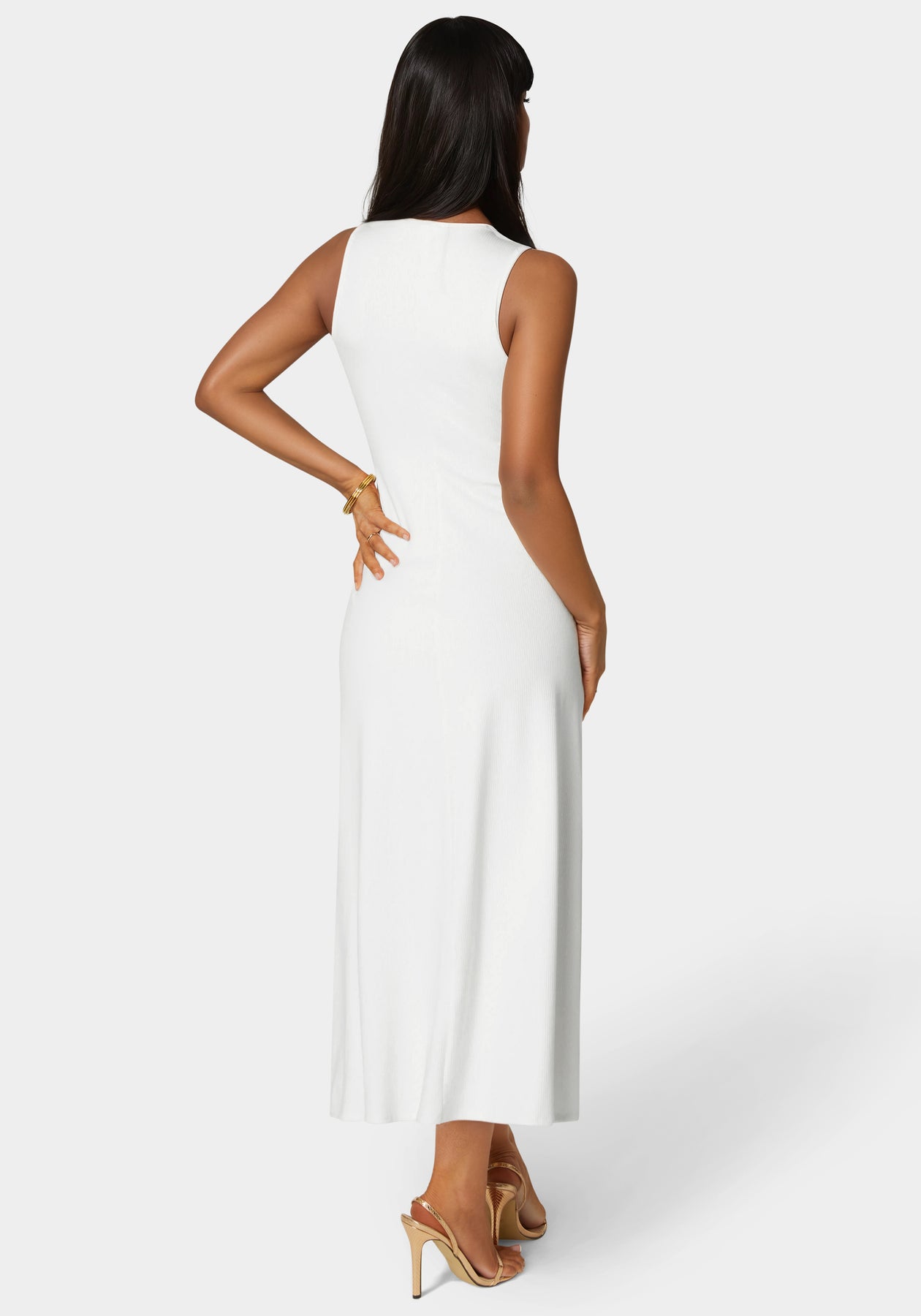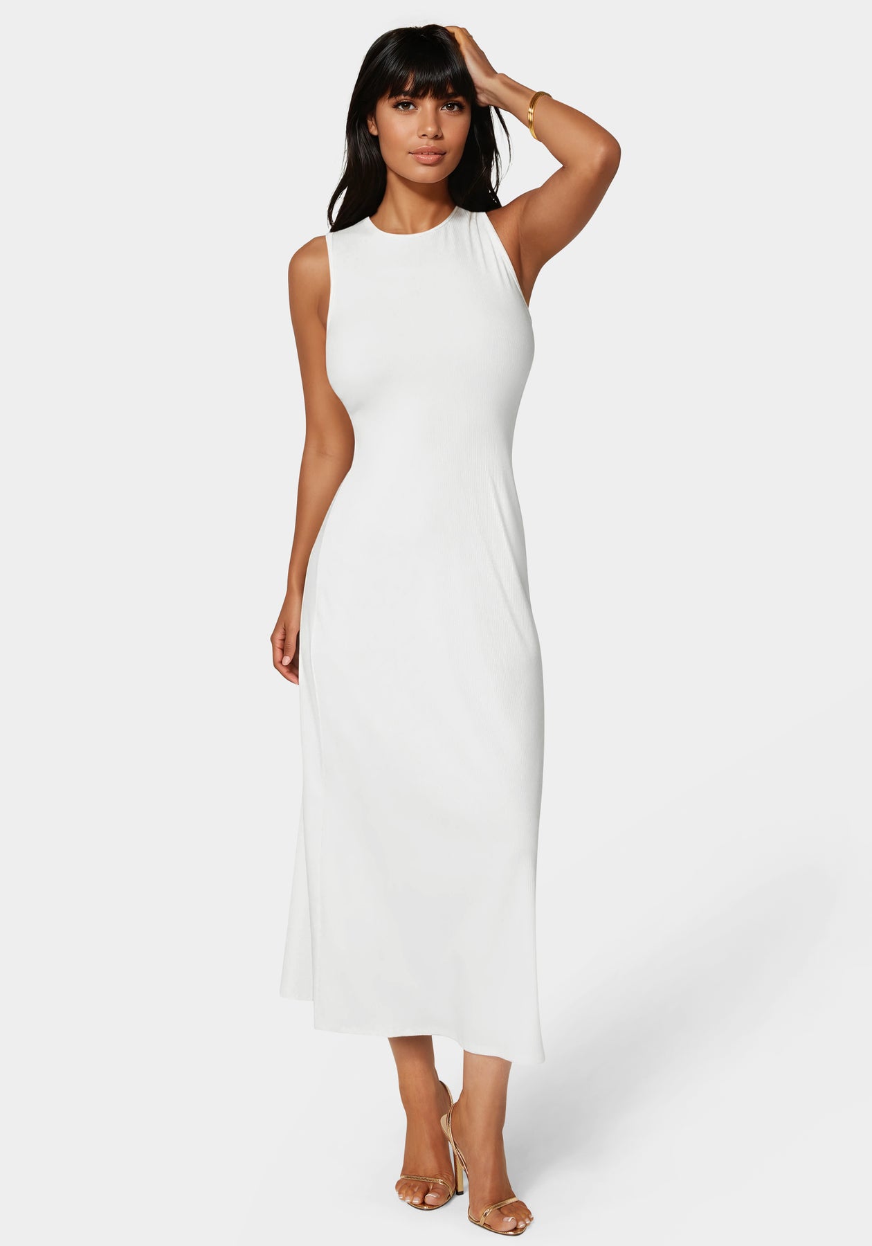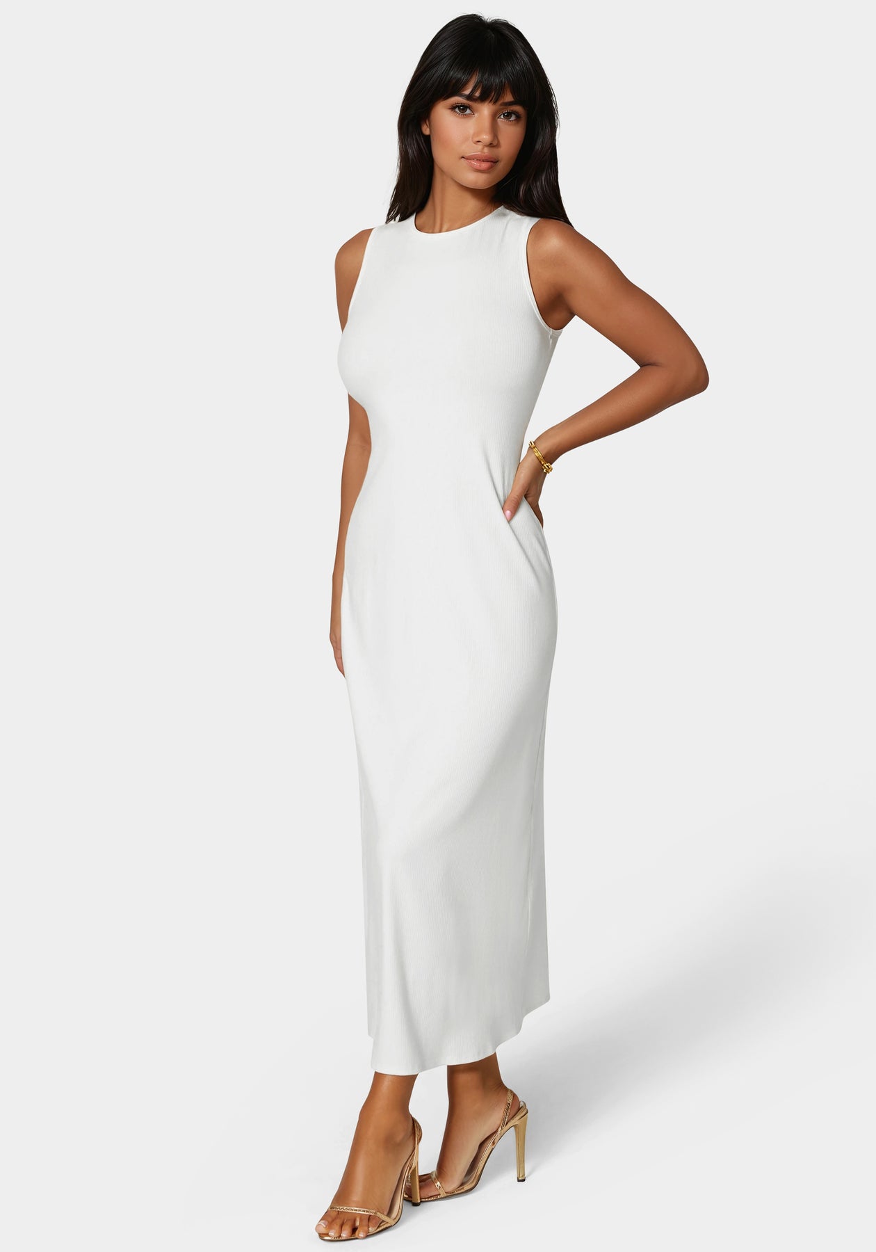Flowy, sleeveless rib maxi dress with a full skirt and heavy fabric, great for casual events or as comfortable summer wear.