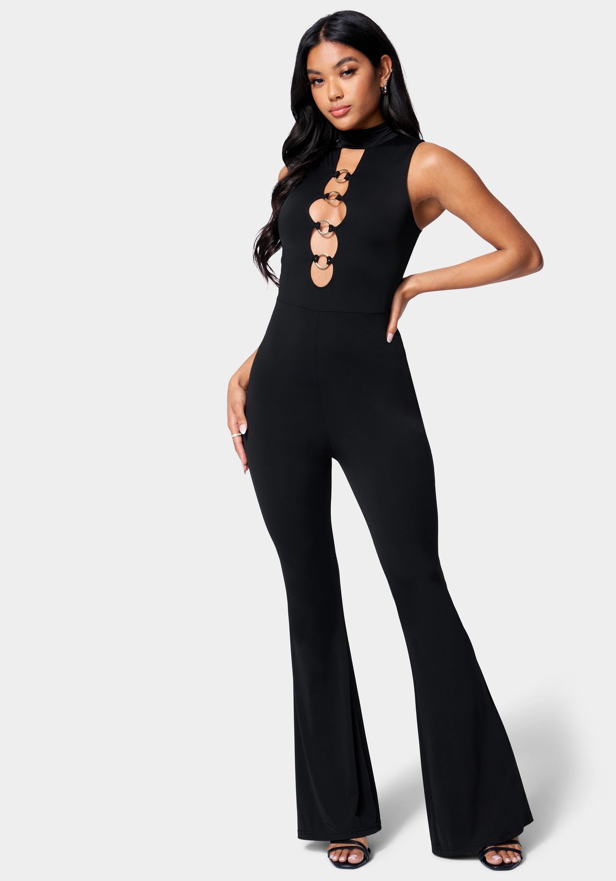 Cat's out of the bag. This sexy, strapless Ring Detail Jumpsuit will have all eyes on you. Features a sultry front cutout design with polished goldtone ring details, and a bodycon silhouette with a flared leg for that extra kick in your step.