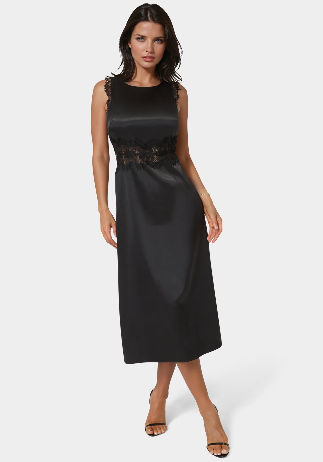 Featuring satin fabric and lace inserts, this sleeveless midi dress is an elegant pick for date nights or formal celebrations where you want a classic, refined look.