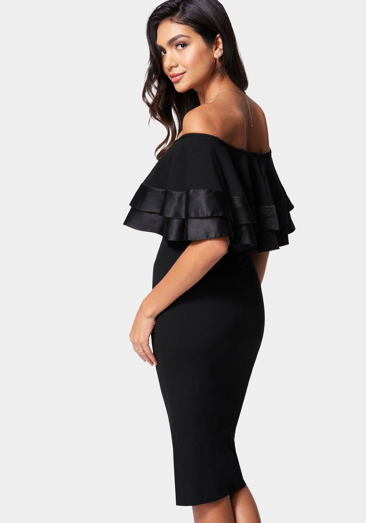 All dressed up. Cut from a stretch knit, this midi dress features a satin trim, flounce layer, off-shoulder silhouette, and a bodycon fit for a glam look that's unmatched.