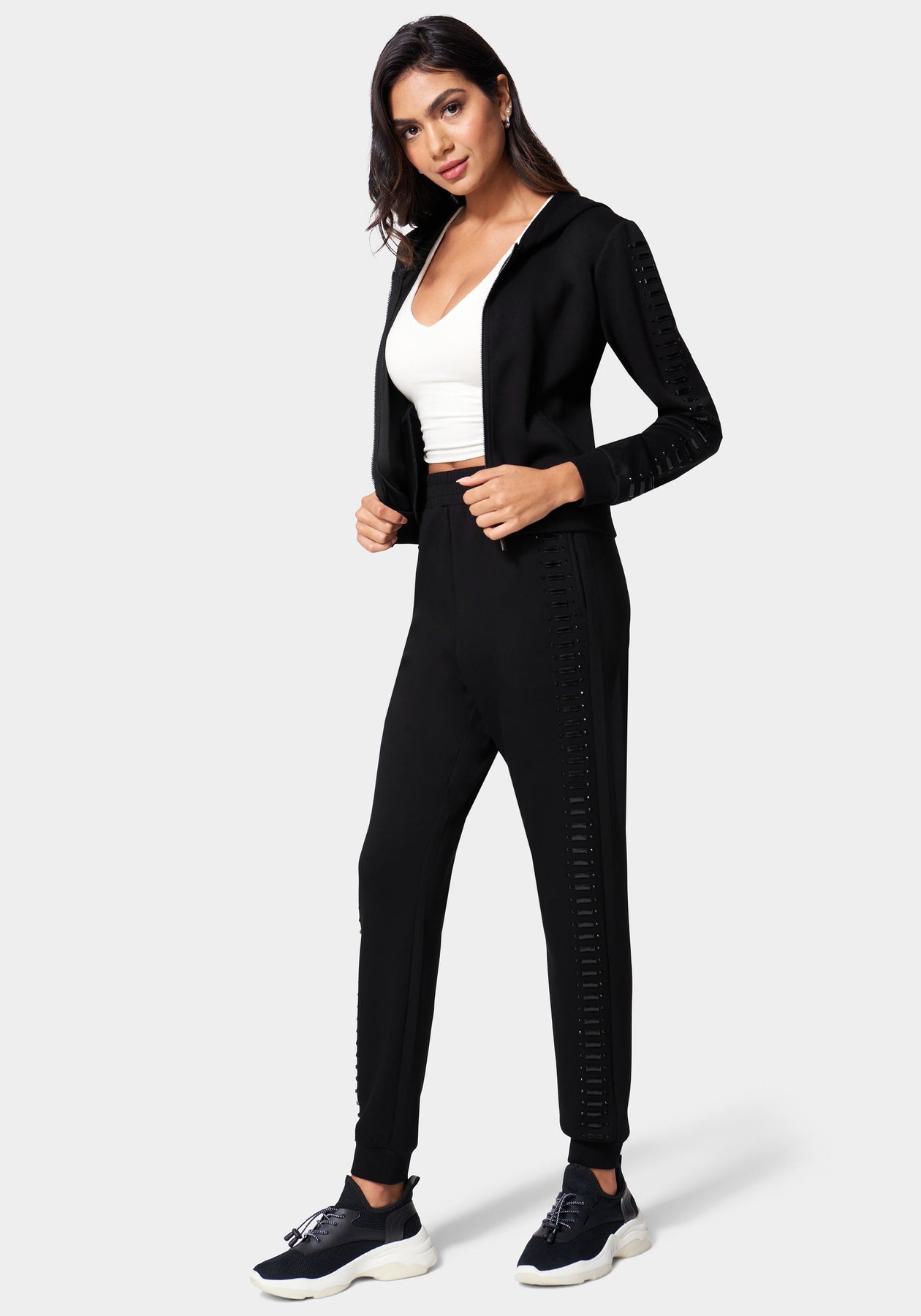 Work it out. This is a scuba knit jogger featuring gemstone embellishments, a drawstring waistband, and front slip pockets. Pairs perfectly with the Scuba Embellished Zip Up Hoodie.