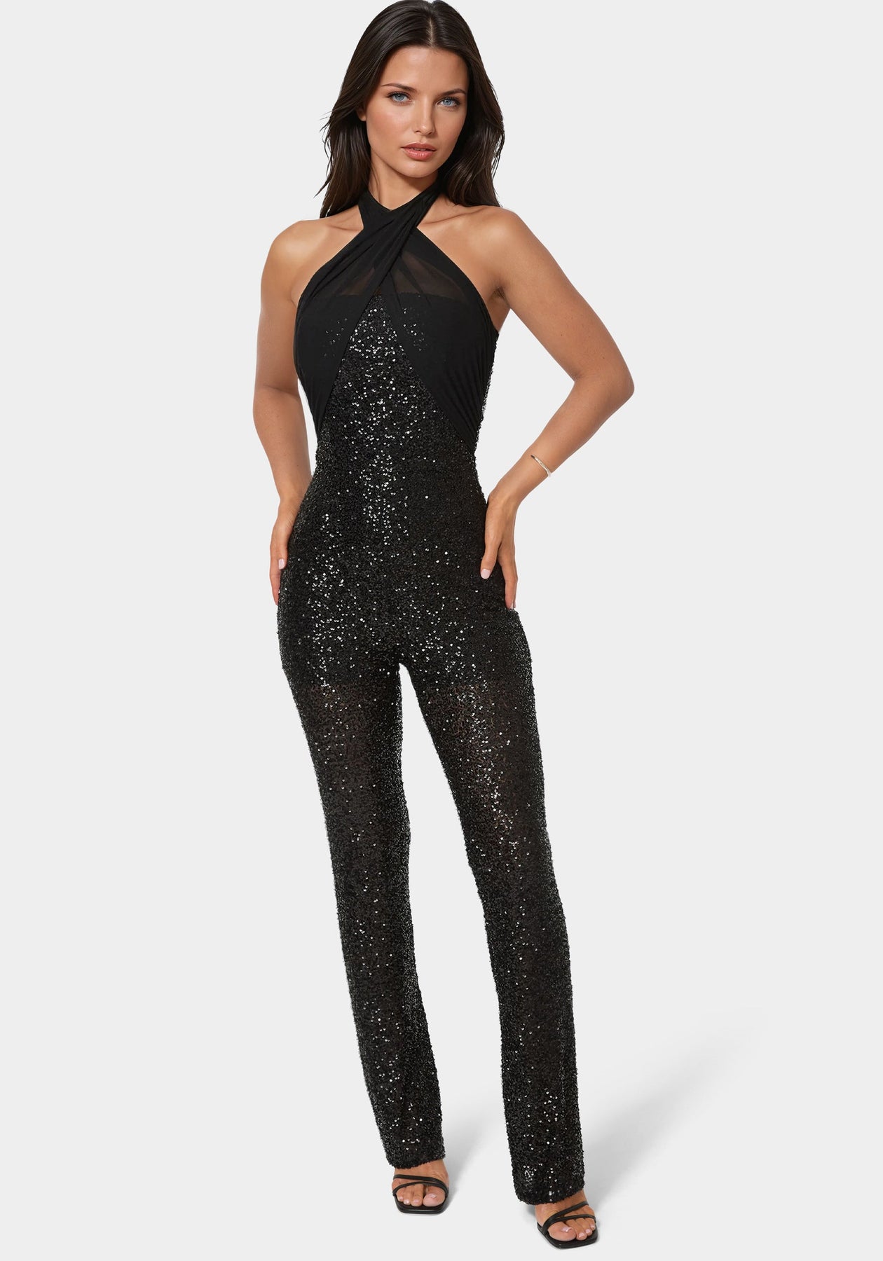 Life of the party vibes come alive in this sequin mini jumpsuit. Flared legs and a halter neckline make it a glamorous choice for the festivities.
