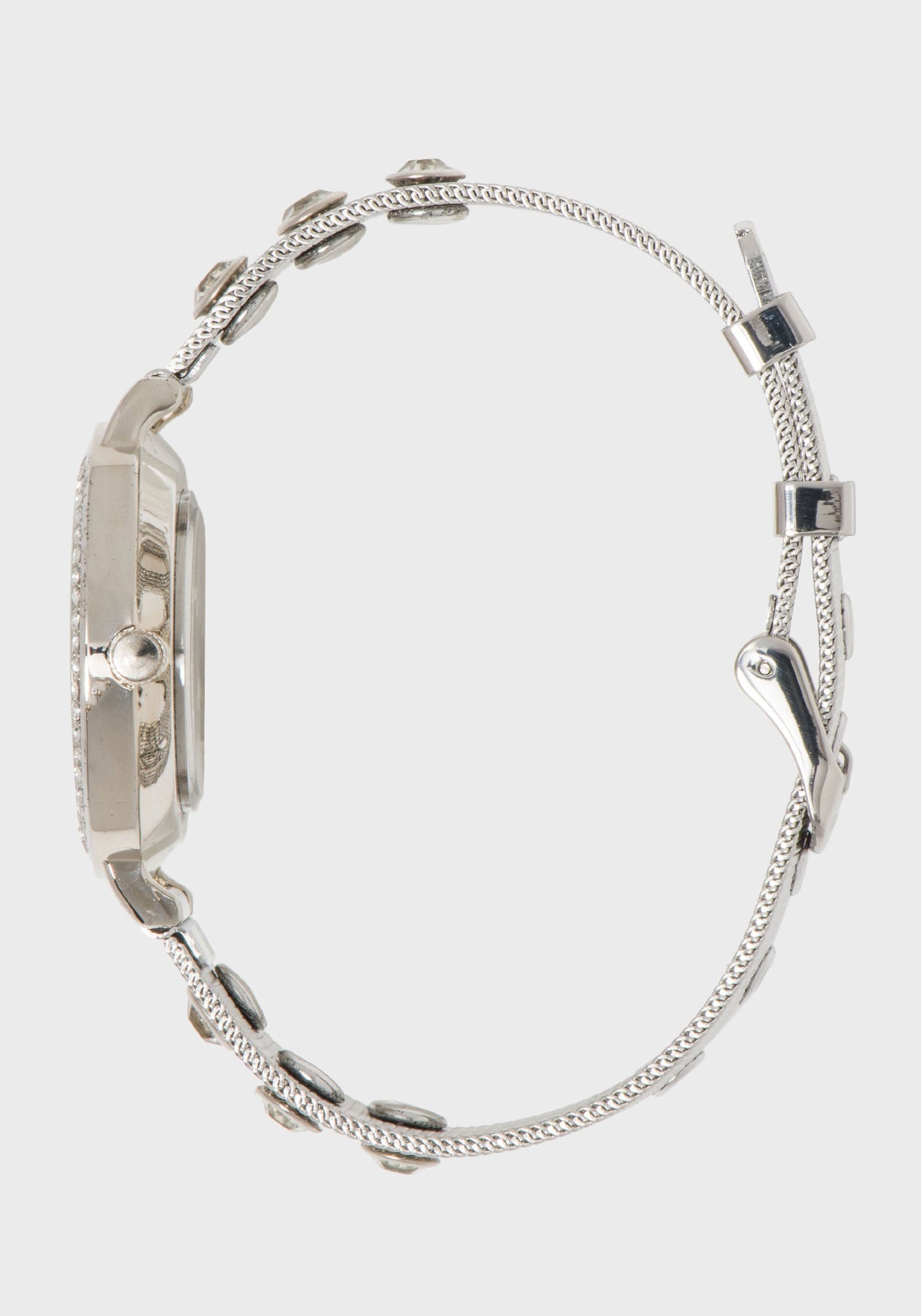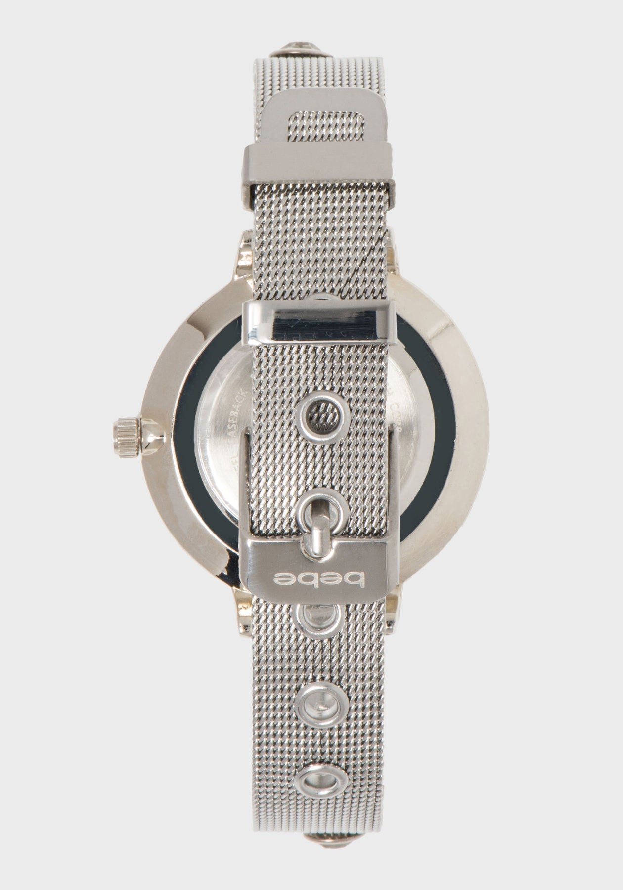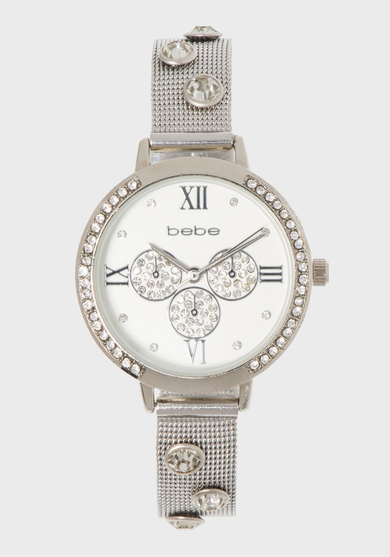 This silvertone crystal watch features a sleek metallic mesh band. Endlessly versatile, this piece pairs effortlessly with jeans or your best evening wear.