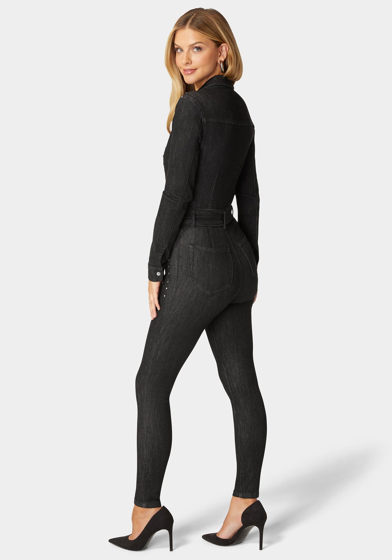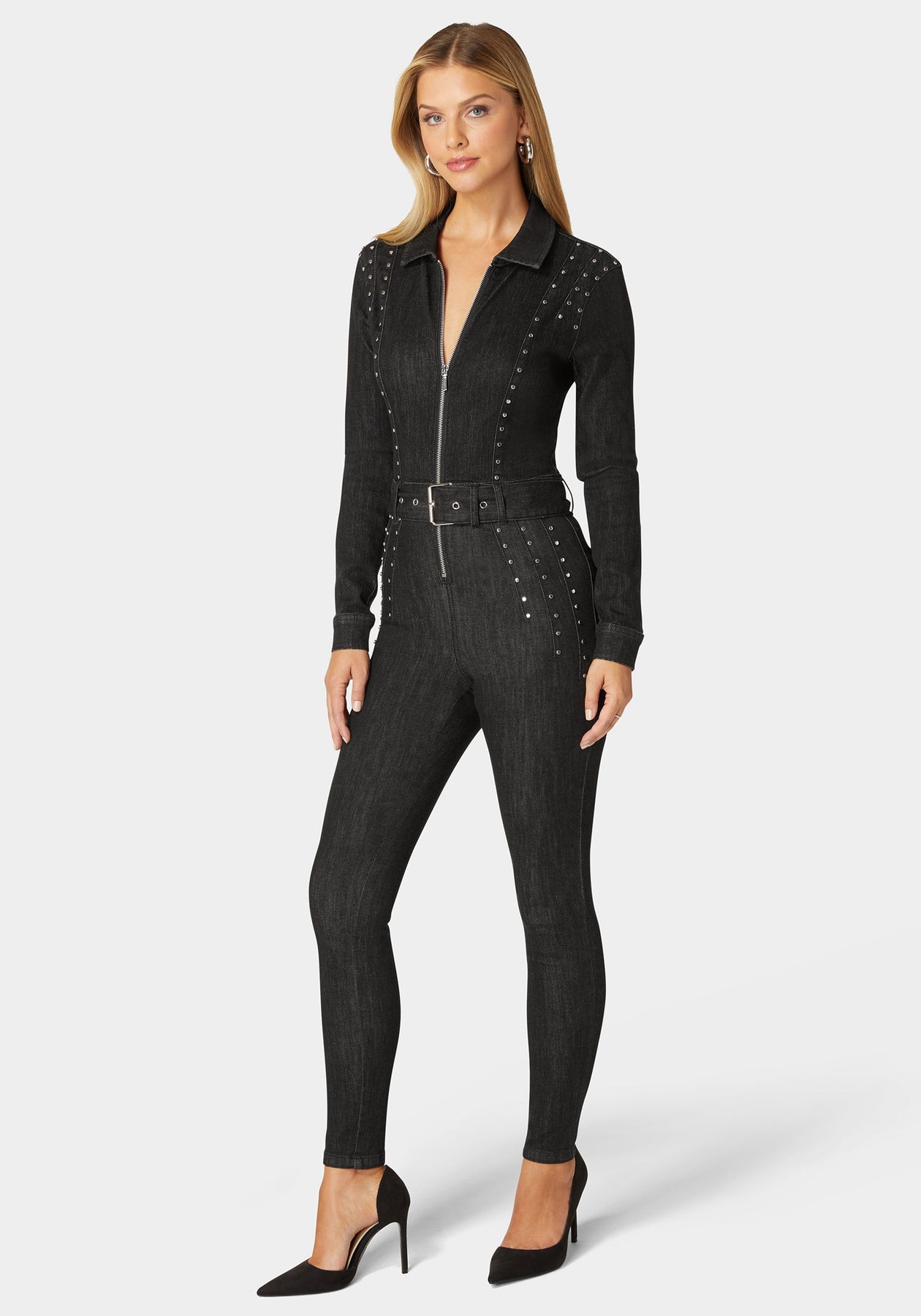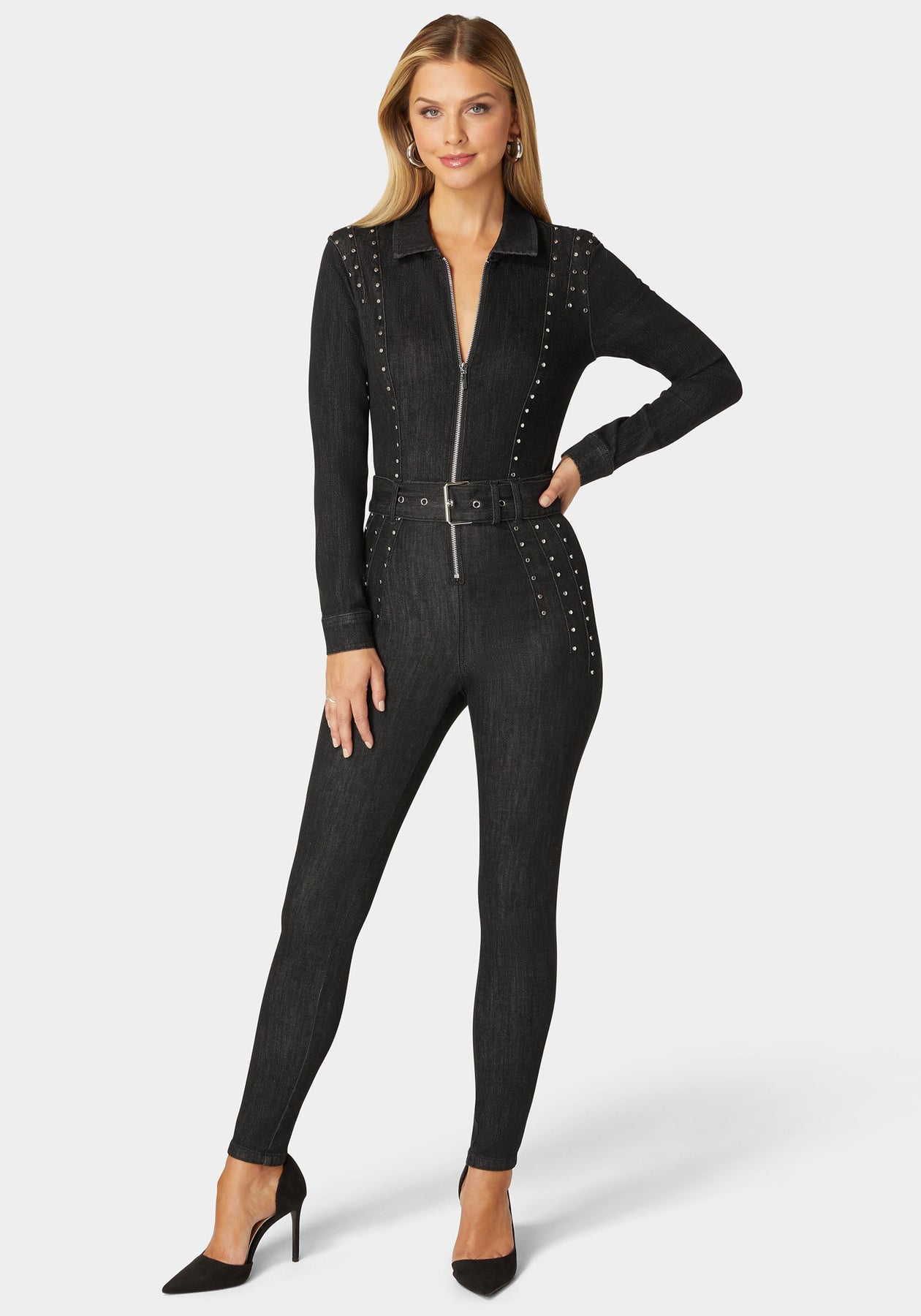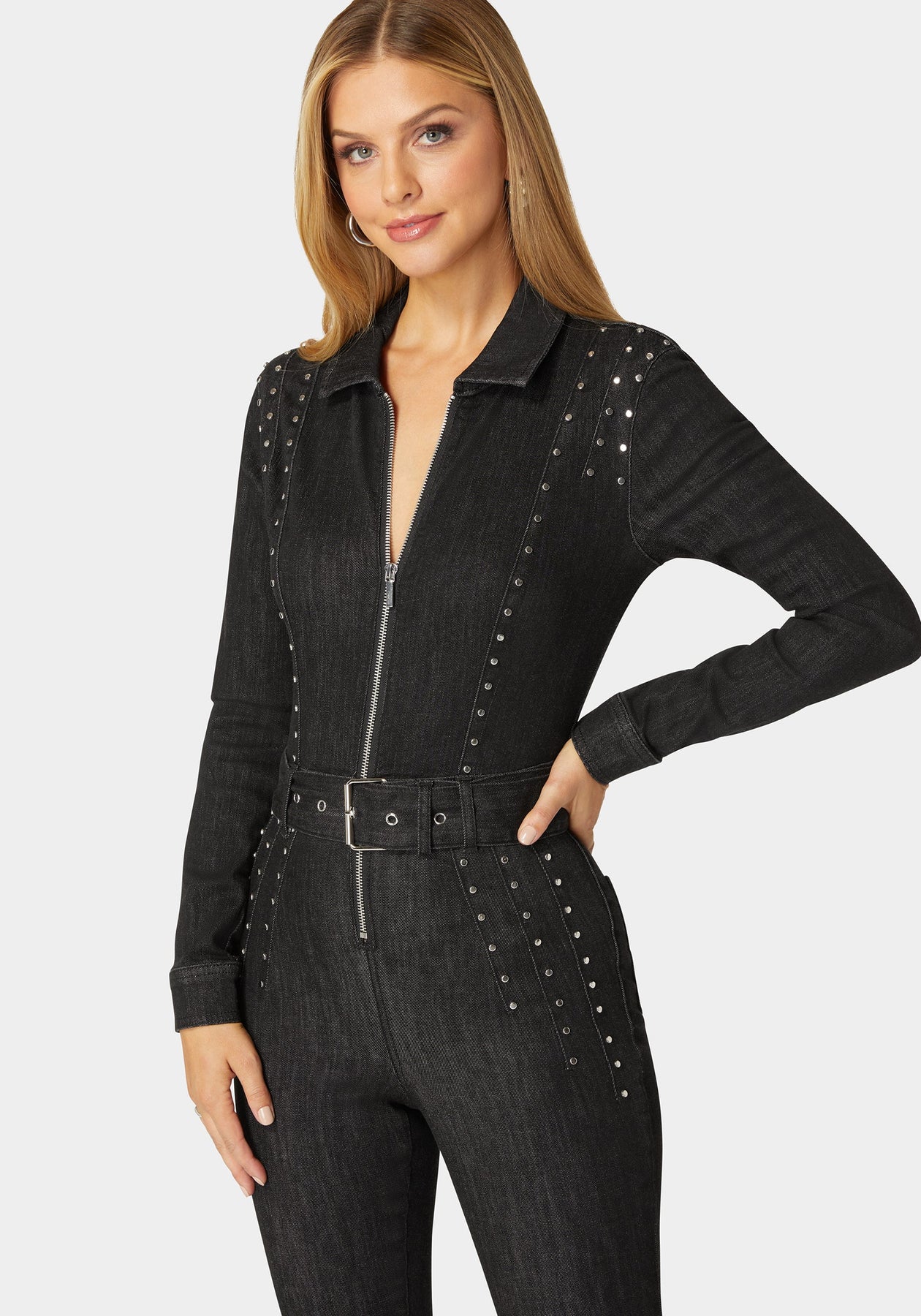 Skinny Studded Zip Up Front Denim Jumpsuit