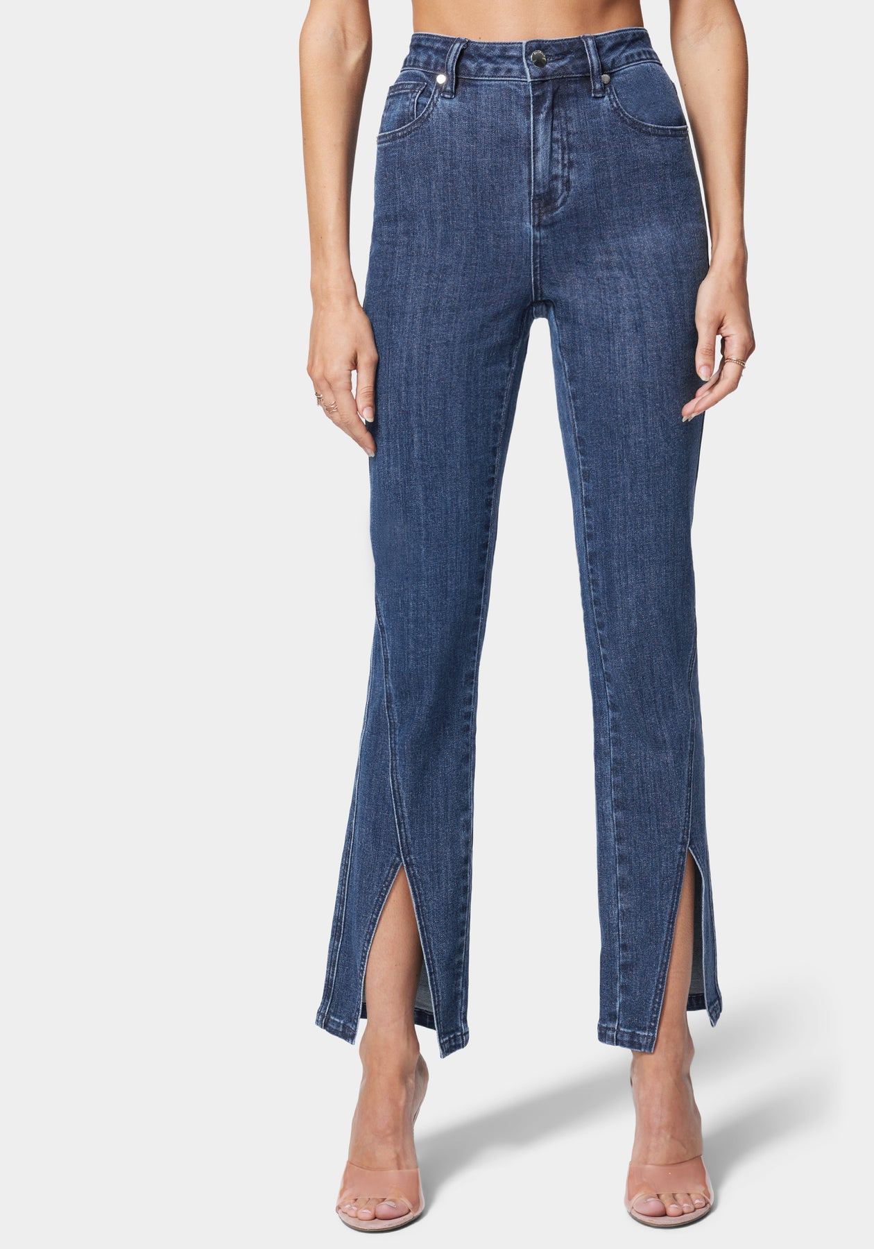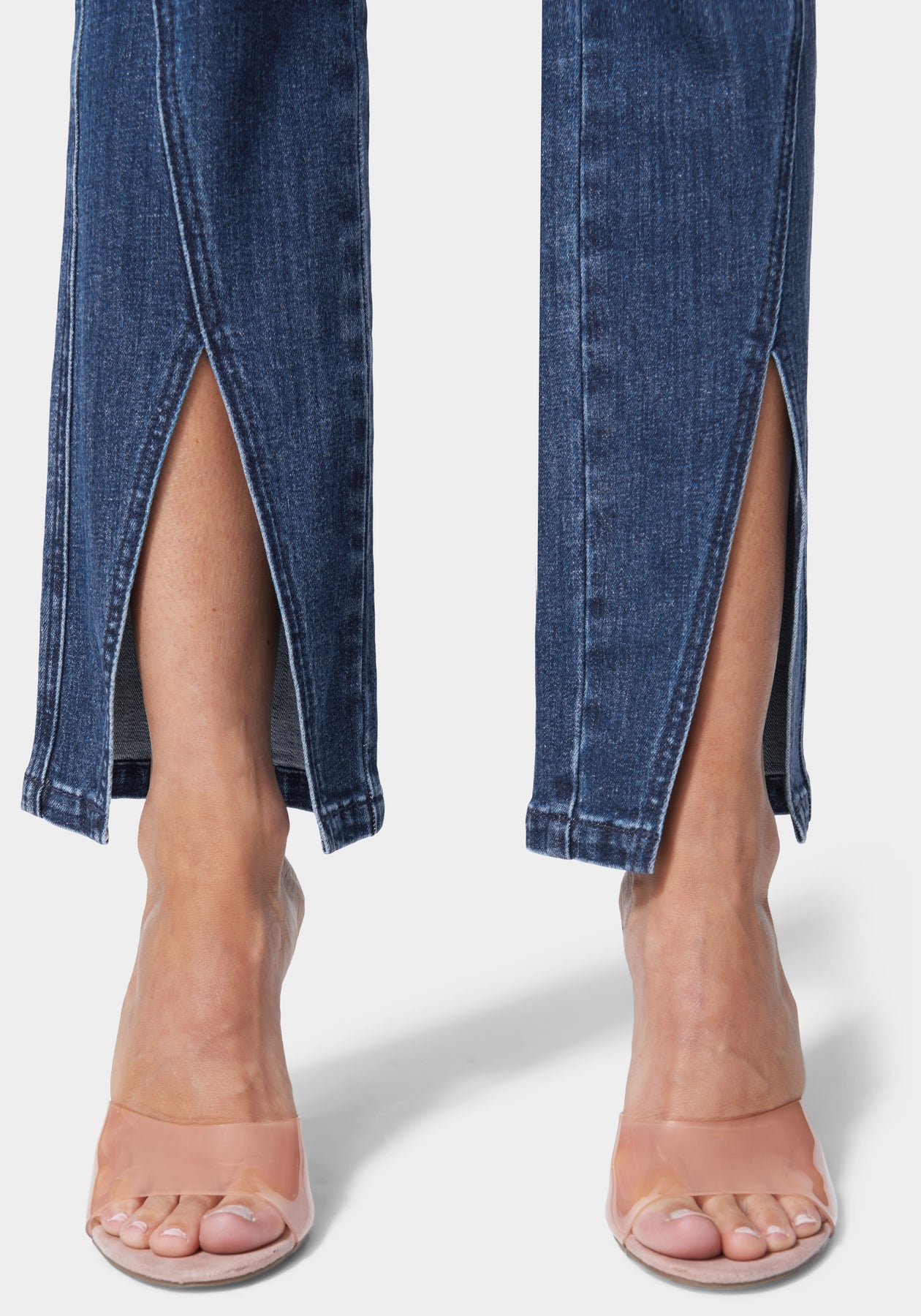Show off some leg. Designed in our medium wash vintage stretch denim, this slim-cut jean sits high at the waist, featuring seam-stitched details that taper off into a slit hem for an edgy look.