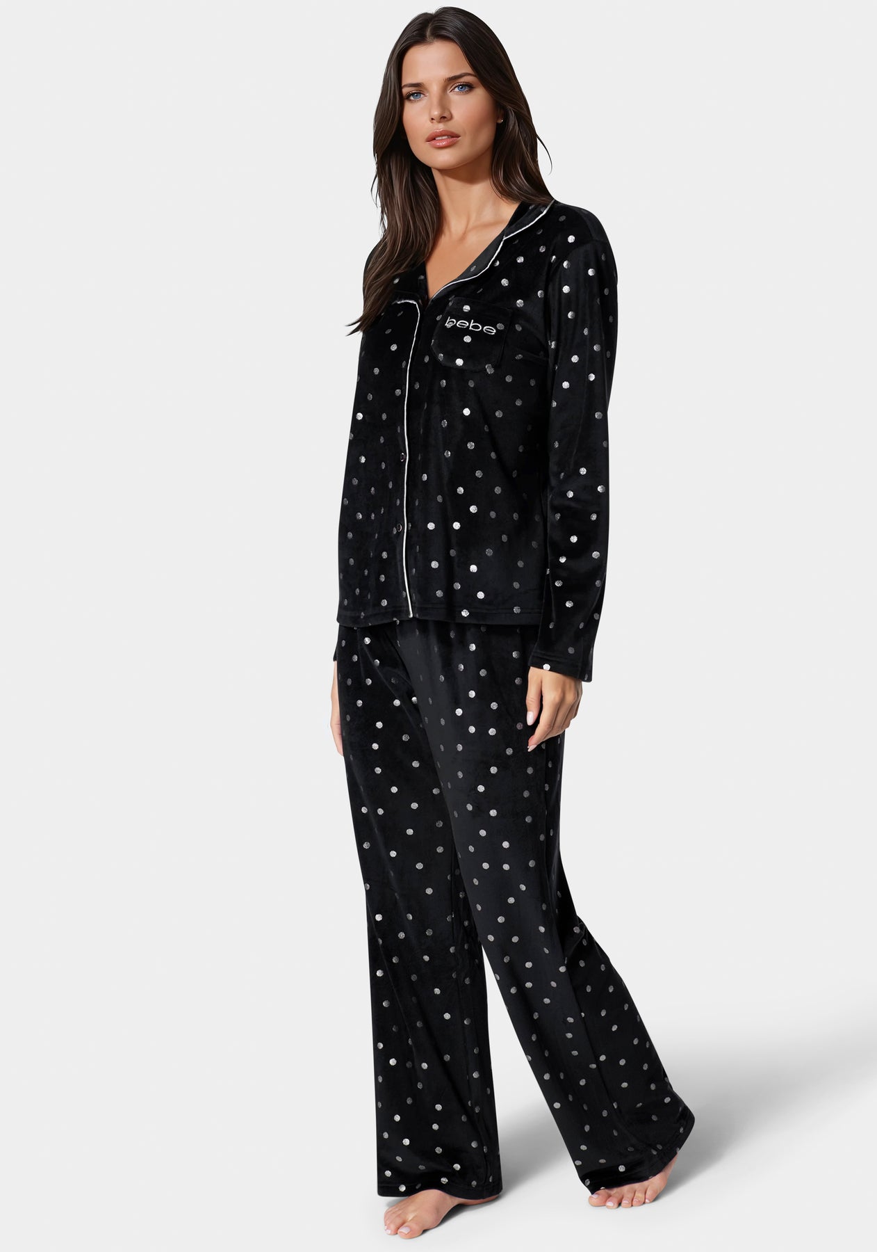 Settle into the night with our black plush pajama set, adorned with silver foil for an added sparkle that complements your style.