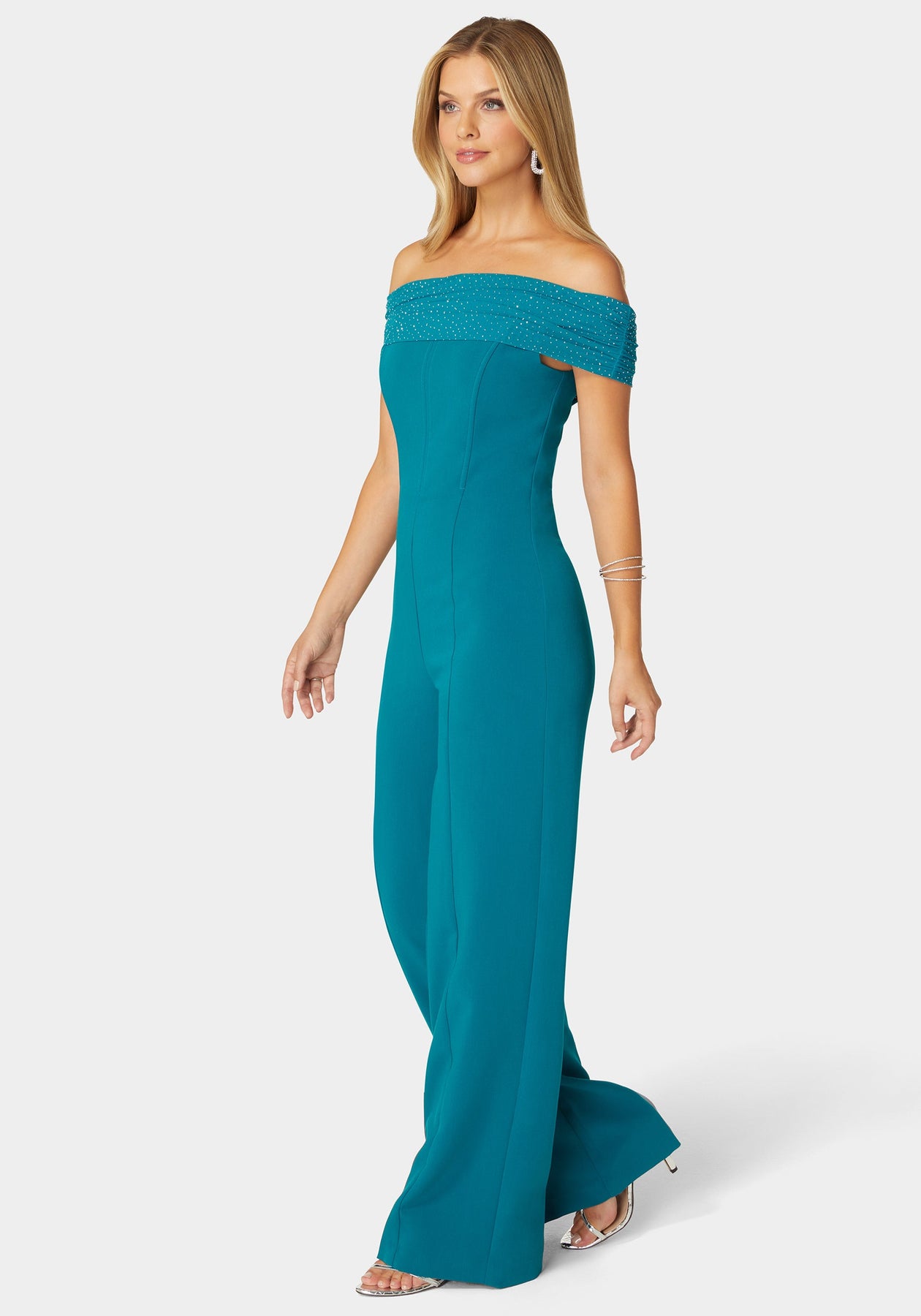 Invoke admiring glances in our studded off-shoulder jumpsuit. The sweeping palazzo style is a perfect fit for exclusive beach parties or swanky yacht gatherings.