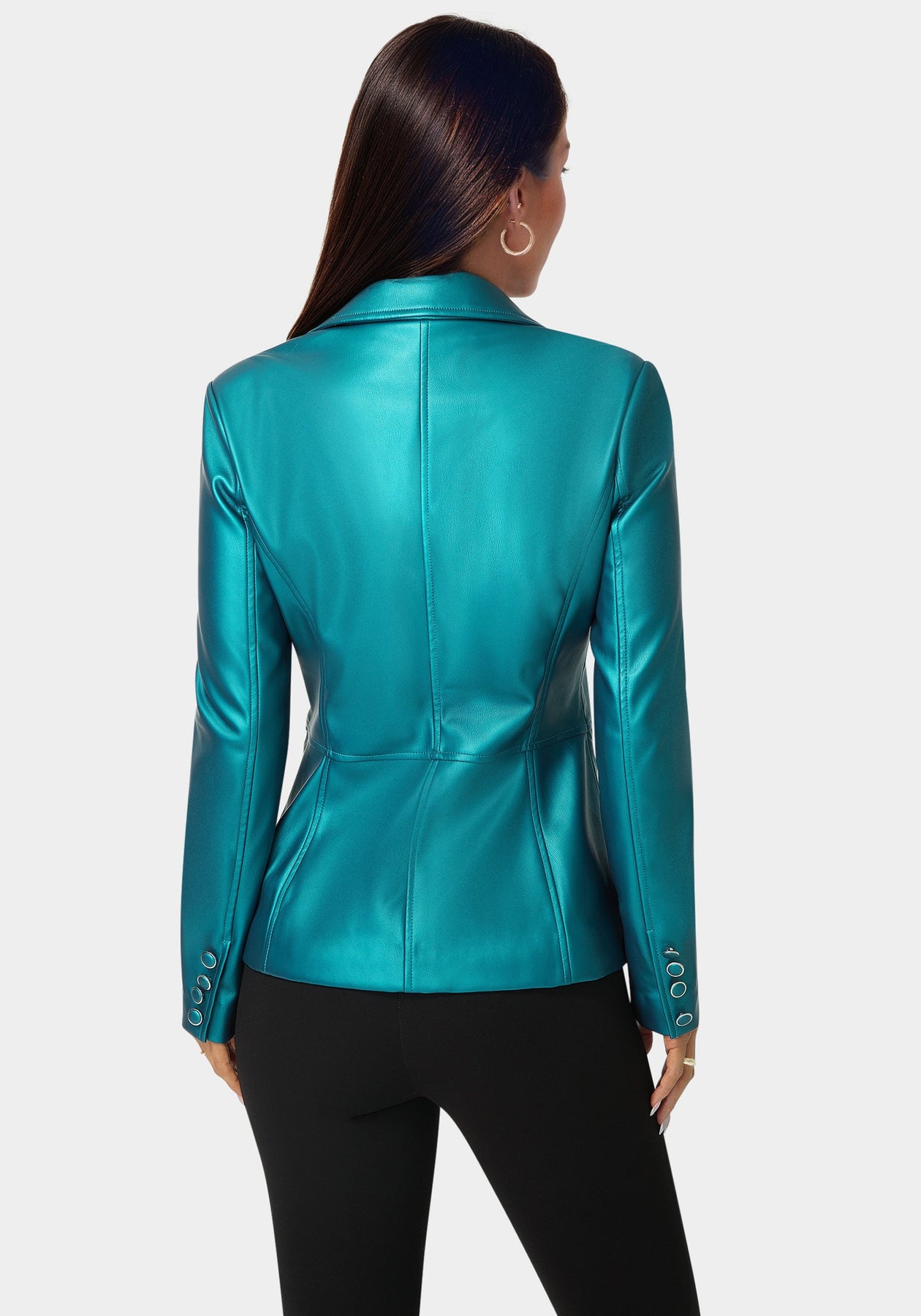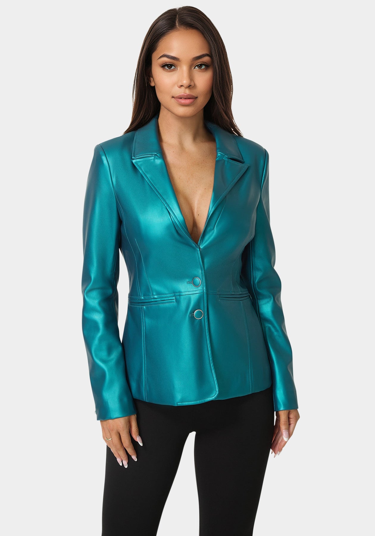 The Tailored Metallic Vegan Leather Blazer is an audacious twist on a timeless piece. Perfect for networking events or avant-garde art show openings, this piece reflects your bold, barrier-breaking style.