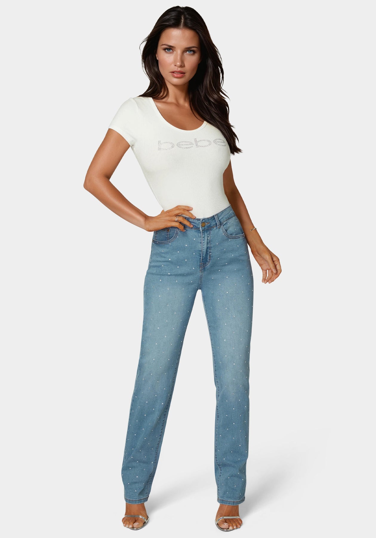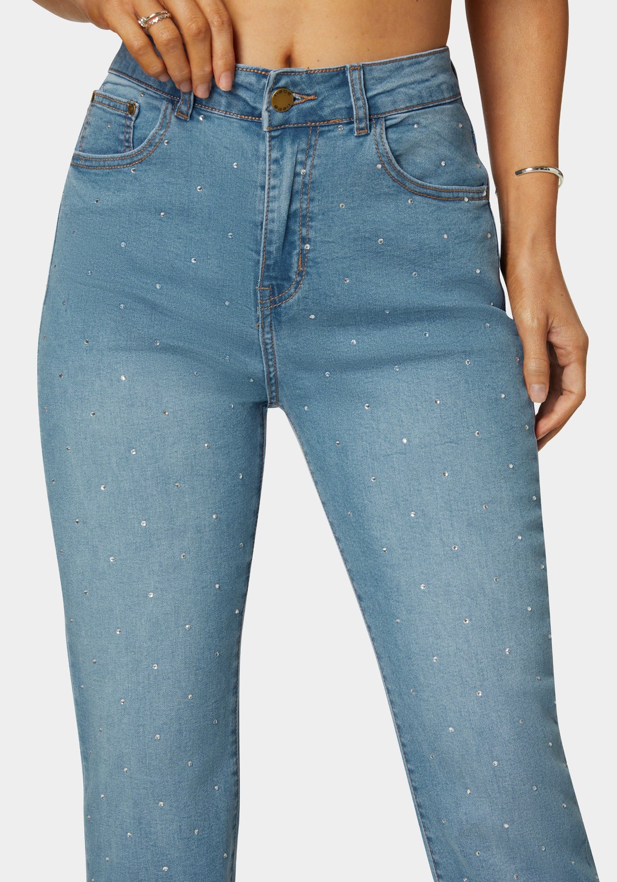 Rhinestone accents bring subtle flair to straight-leg jeans. Ideal for rooftop cocktails or evening outings with effortless style.