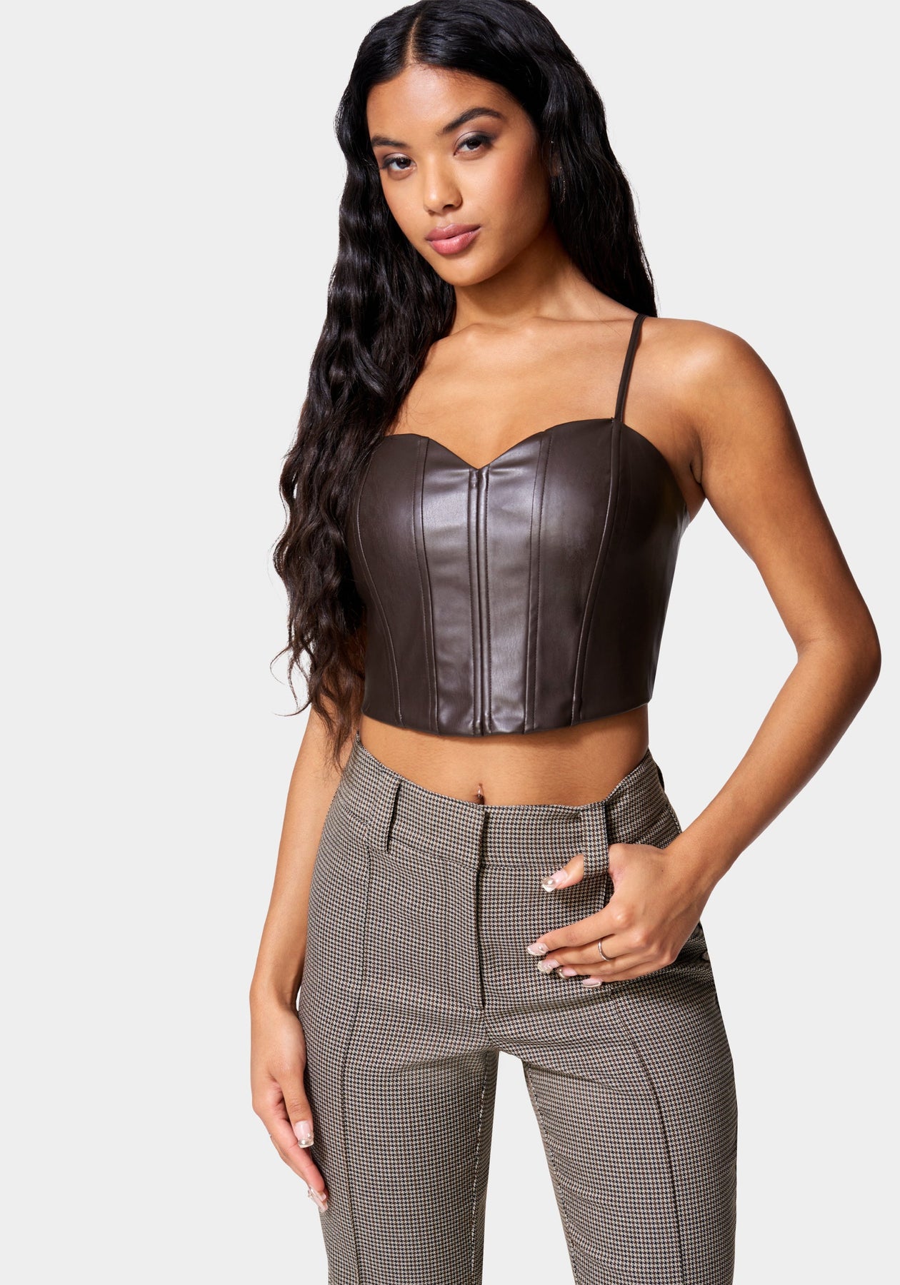 Better than leather. This sleek bustier features vegan leather construction with seam-stitched details along the front, a sweetheart neckline, adjustable straps, and a back zipper for a perfect fit.
